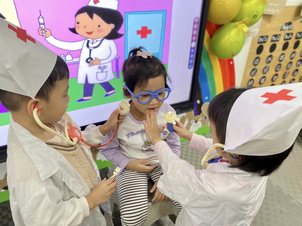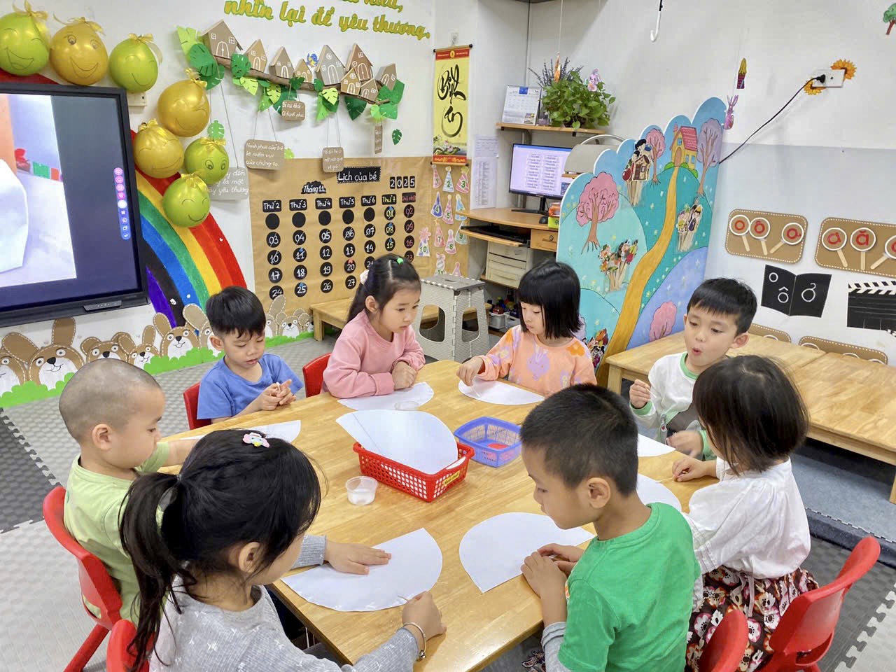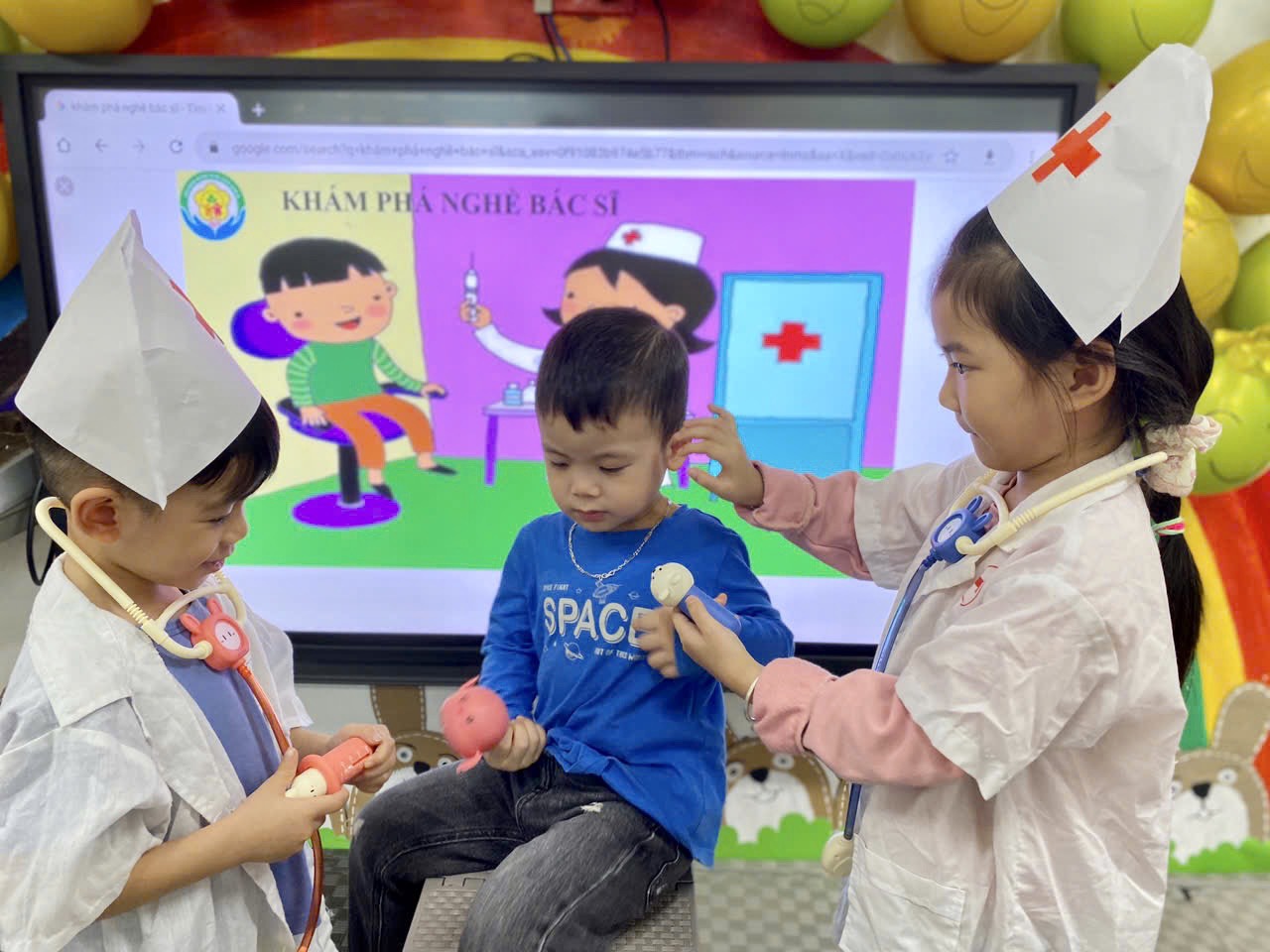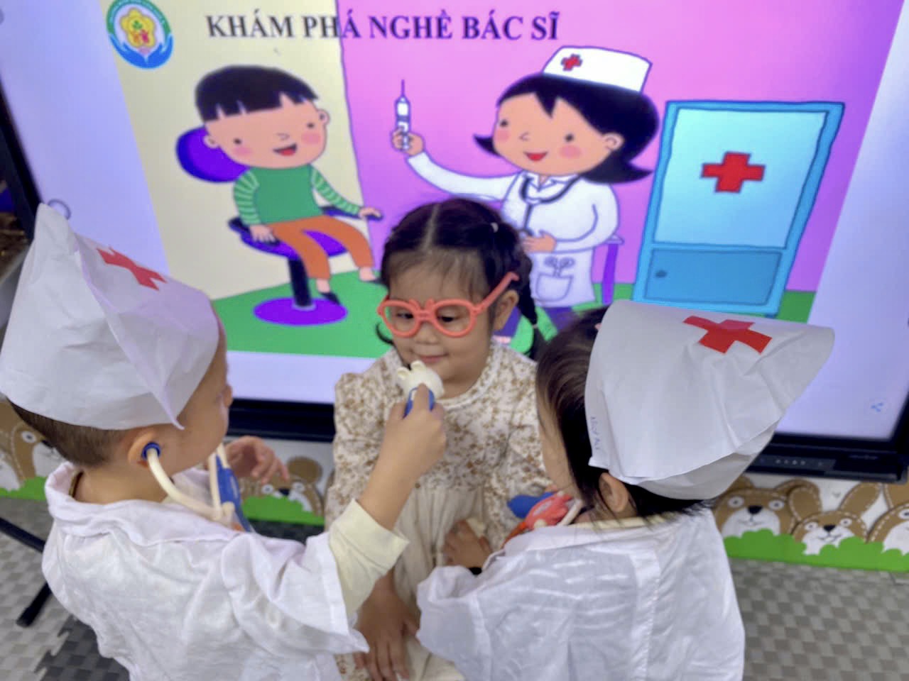 Dưới sự hướng dẫn của cô giáo, các bé đã cùng nhau quan sát mẫu mũ bác sĩ, trò chuyện về công việc của bác sĩ và bắt tay vào tự tay tạo nên những chiếc mũ đáng yêu của riêng mình. Với những tờ giấy trắng, kéo, hồ dán và chút khéo léo, đôi bàn tay nhỏ xinh của các bé đã biến những vật liệu đơn giản trở thành những chiếc mũ bác sĩ xinh xắn, có hình dấu thập đỏ nổi bật ở giữa. Bé nào cũng hào hứng, chăm chú cắt, dán, trang trí cho chiếc mũ của mình thật đẹp. Không chỉ giúp trẻ rèn luyện sự khéo léo và khả năng tập trung, hoạt động còn mang đến cho các bé niềm vui được hóa thân thành “bác sĩ nhí”, biết yêu quý và trân trọng nghề nghiệp cao quý – nghề chăm sóc, cứu chữa người bệnh.