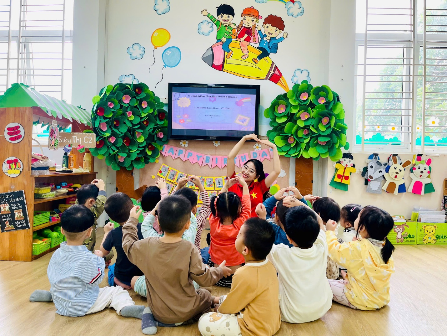Mở đầu tiết học, các con cùng hát và vận động theo bài “I Love Math”, khơi dậy niềm hứng khởi và tinh thần học tập vui tươi. Sau đó, cô và trò cùng ôn lại bài “Nhận biết tay trái – tay phải”, tạo không khí sôi nổi, tràn ngập tiếng cười.