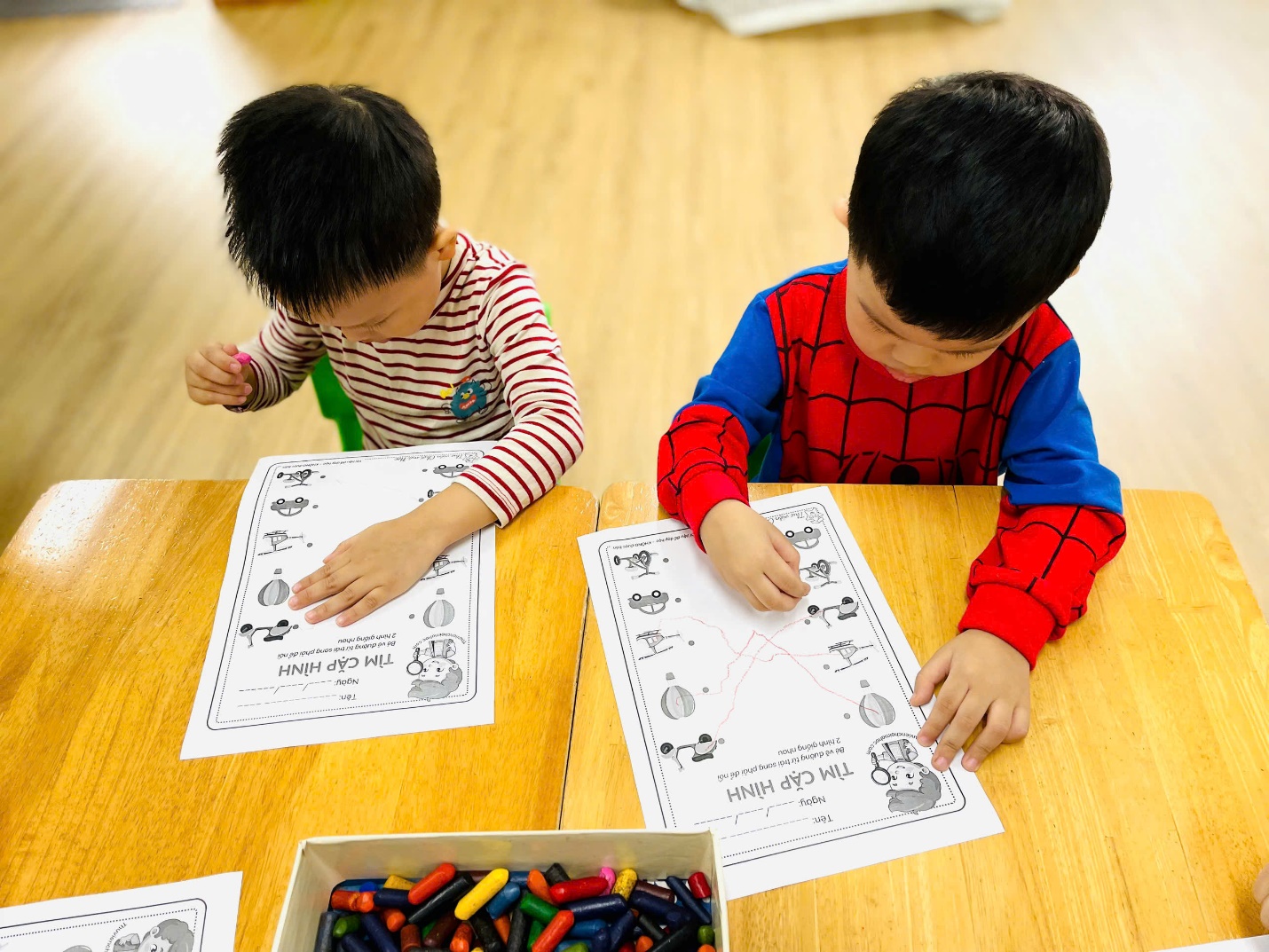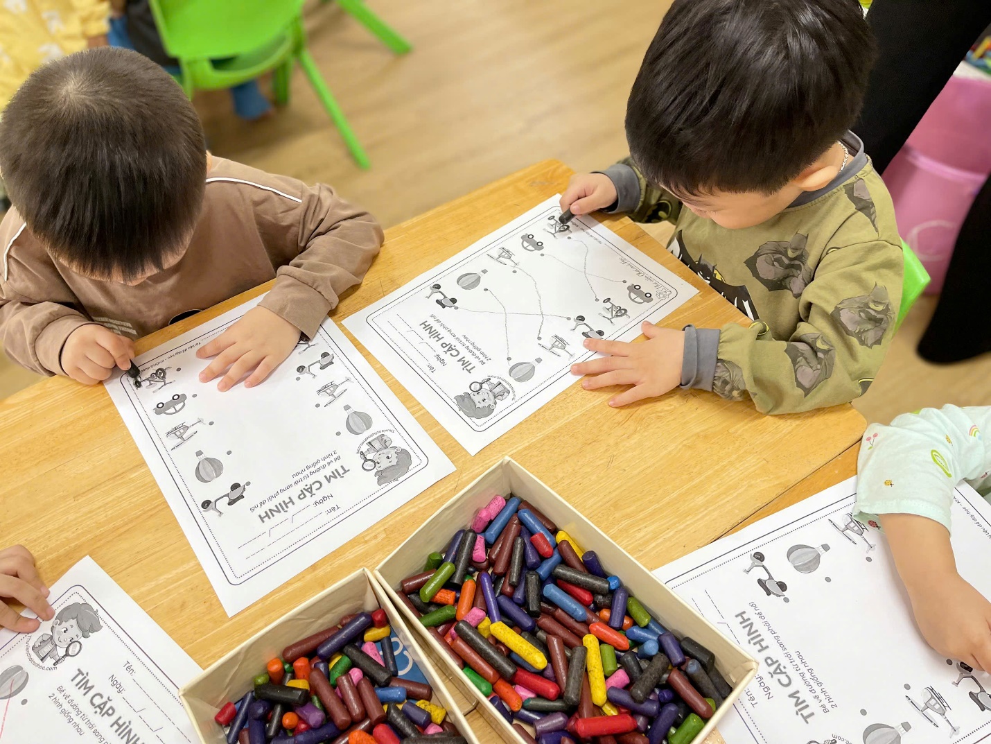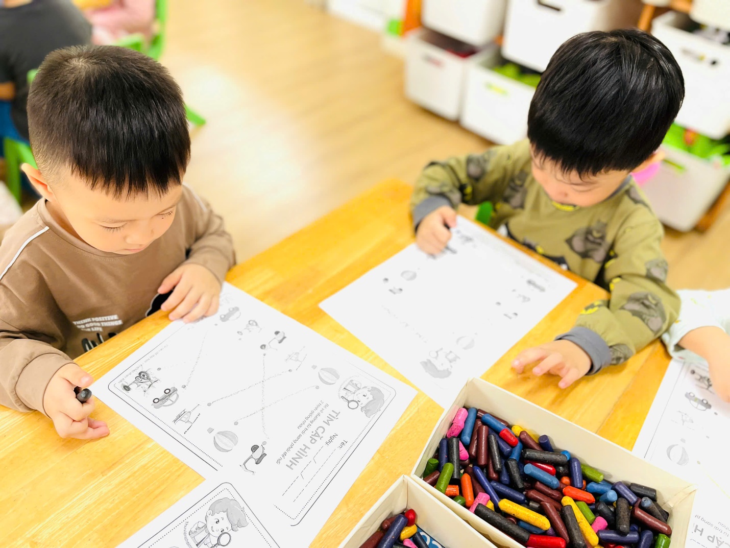 Cuối cùng, sau khi học, các con được tham gia vào trò chơi ghép đôi vui nhộn và làm các bài tập thực hành. Bé nào cũng hào hứng, chăm chú, vừa chơi vừa học, thể hiện sự tập trung và niềm vui khi chinh phục thử thách nhỏ của mình.