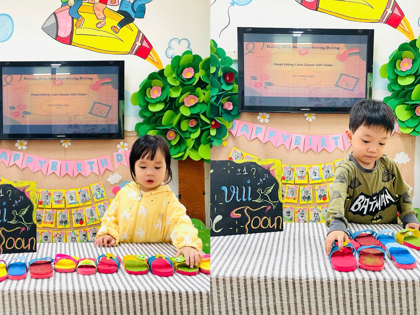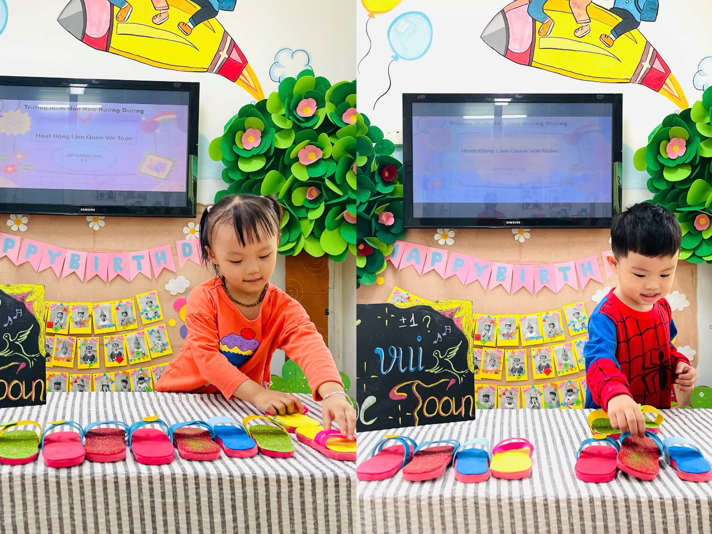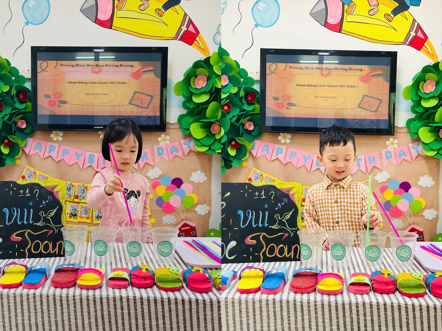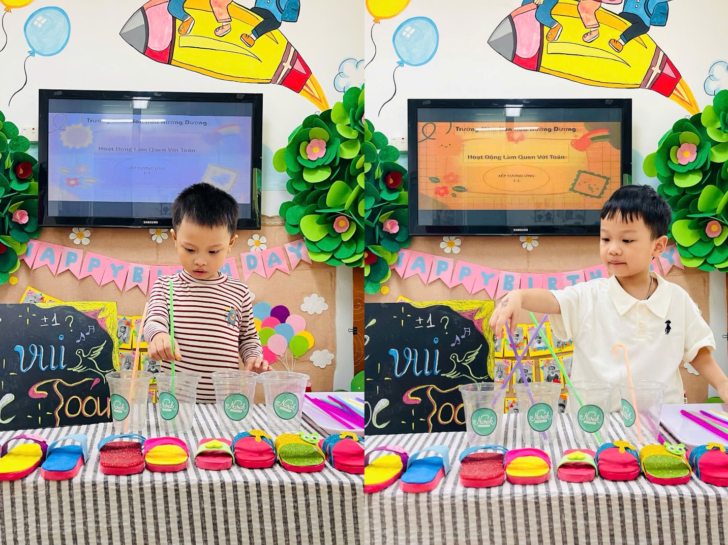 Bước vào hoạt động chính, với những đồ dùng quen thuộc như ống hút, cốc nhựa, dép xốp..., các bé hào hứng thực hành xếp từng đôi vật tương ứng, vừa học vừa chơi, rèn luyện khả năng quan sát, tư duy và sự khéo léo. Kết thúc giờ học, các con tham gia trò chơi ghép đôi vui nhộn, cùng nhau hoàn thành thử thách trong niềm hân hoan và tự hào.