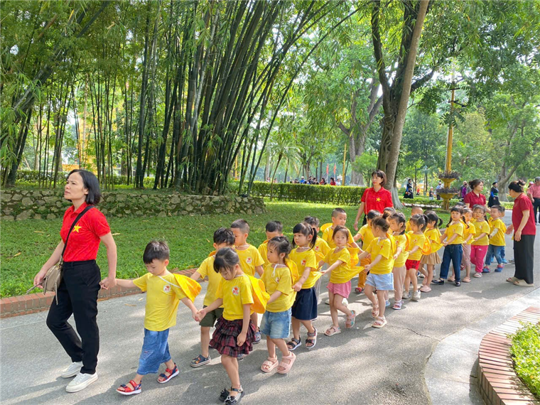 Đến Lăng Bác, các bé được các cô giáo ân cần hướng dẫn xếp hàng ngay ngắn, lắng nghe những lời dặn dò nhẹ nhàng về sự trang nghiêm và lòng thành kính. Các em ngoan ngoãn đi bên cạnh cô giáo, đôi mắt chăm chú nhìn ngắm và cảm nhận sự vĩ đại, sự giản dị mà thiêng liêng của nơi đây.