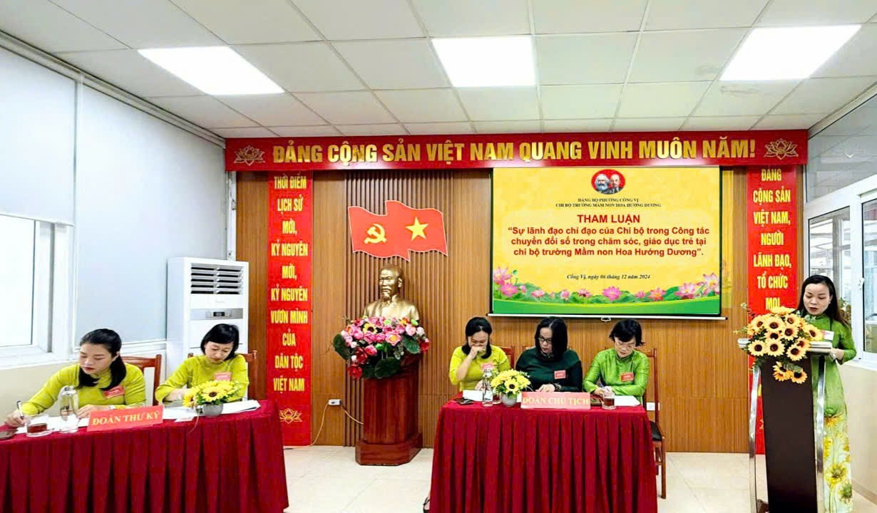 Phát biểu chỉ đạo tại Đại hội, đồng chí Vũ Thanh Hà- Bí thư Đảng ủy phường Cống Cống Vị đánh giá cao các ý kiến thảo luận trong Đại hội của Chi bộ Trường Mầm non Hoa Hướng Dương, cũng như kết quả thực hiện các chỉ tiêu, nhiệm vụ Nghị quyết nhiệm kỳ 2022 - 2025. Đồng thời đề nghị Chi bộ cần bám sát các chỉ tiêu, nhiệm vụ trong nhiệm kỳ mới, trong đó tăng cường giáo dục chính trị tư tưởng cho cán bộ, đảng viên