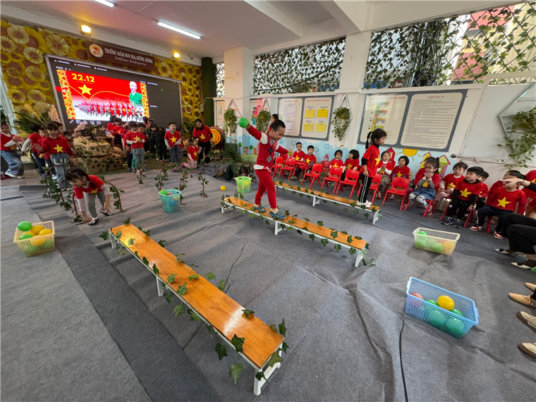Các bé được tham gia vào các trò chơi vận động như "Vượt chướng ngại vật", "Tiếp sức", "Chuyển đạn"... Các trò chơi không chỉ rèn luyện sức khỏe, sự nhanh nhẹn, khéo léo mà còn giúp các bé hiểu được sự vất vả của các chú bộ đội trong quá trình huấn luyện.