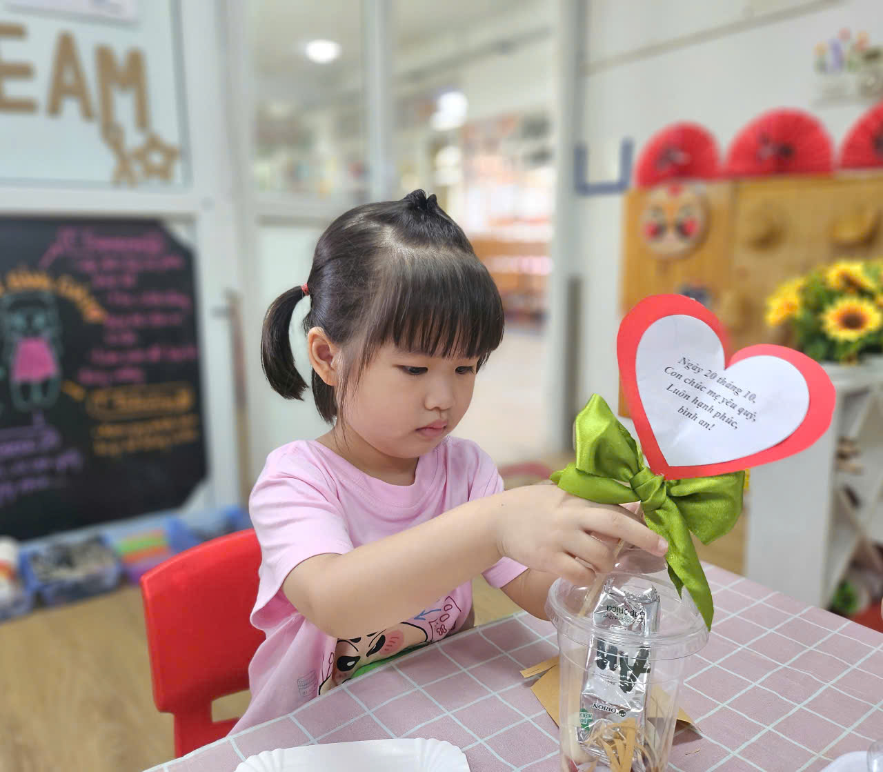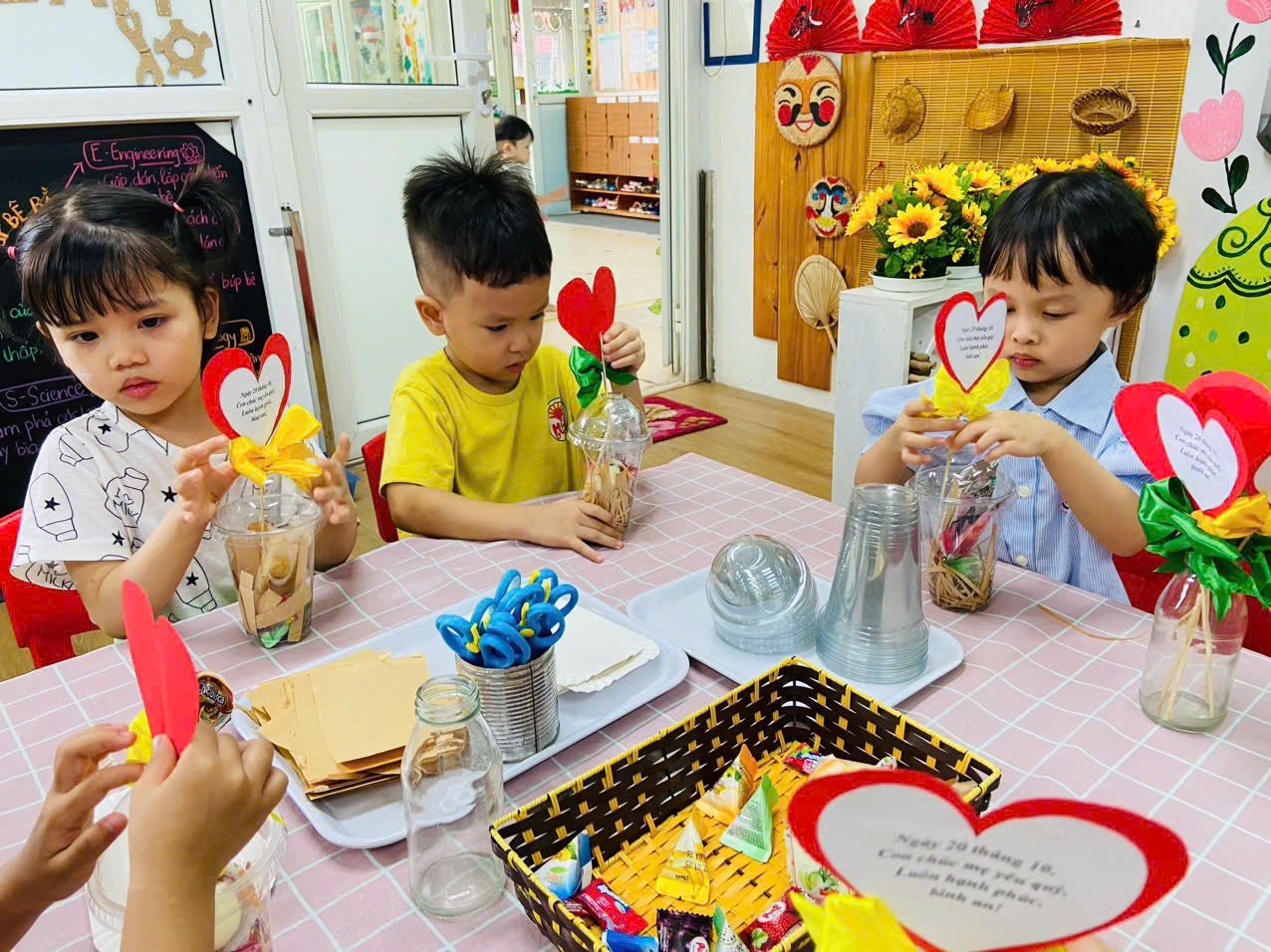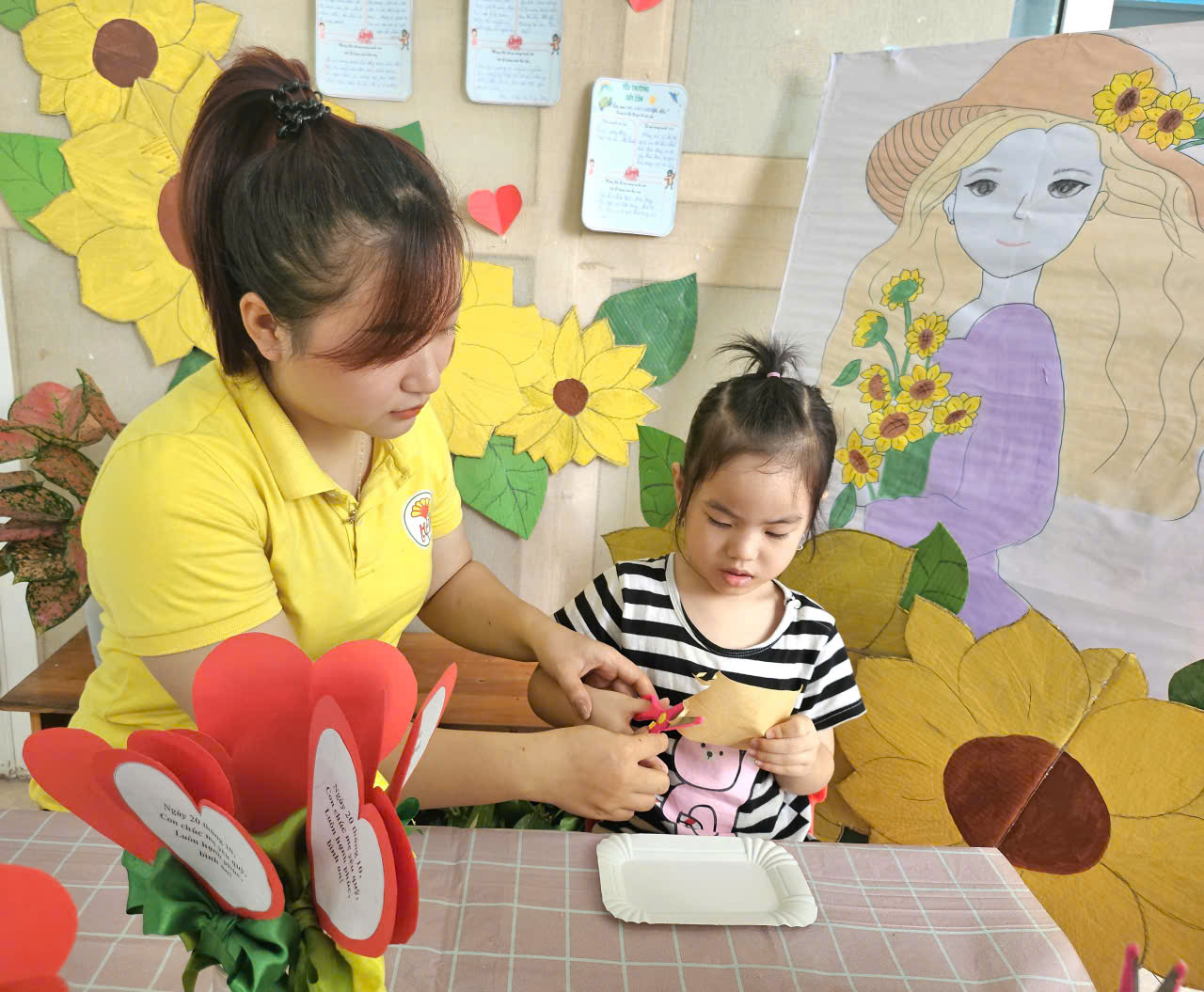 Ngay từ sáng, không khí của lớp đã trở nên rộn ràng hơn thường lệ. Trên bàn là những nguyên vật liệu quen thuộc: giấy màu, ruy băng, keo dán, bút màu… Dưới sự hướng dẫn nhẹ nhàng của cô giáo, đôi bàn tay nhỏ xinh của các bé bắt đầu cắt, dán, tô, trang trí thật chăm chú món quà của mình tặng mẹ