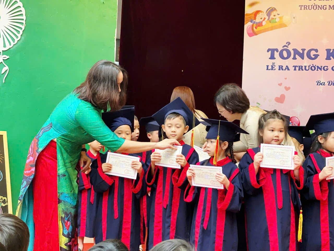 Những lời ca, điệu múa ngây thơ nhưng đầy ý nghĩa, những khoảnh khắc các bé trao gửi tình cảm, lời tri ân đến thầy cô và cha mẹ đã khiến cả sân trường trần ngập tự hào và cảm xúc. Đây không chỉ là lễ ra trường mà còn là một dấu mốc quan trọng, khẳng định sự trưởng thành về thể chất, trí tuệ và tinh thần của các con, chuẩn bị sẵn sàng cho hành trình tiểu học sắp tới.