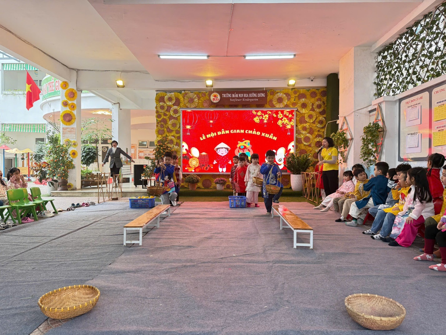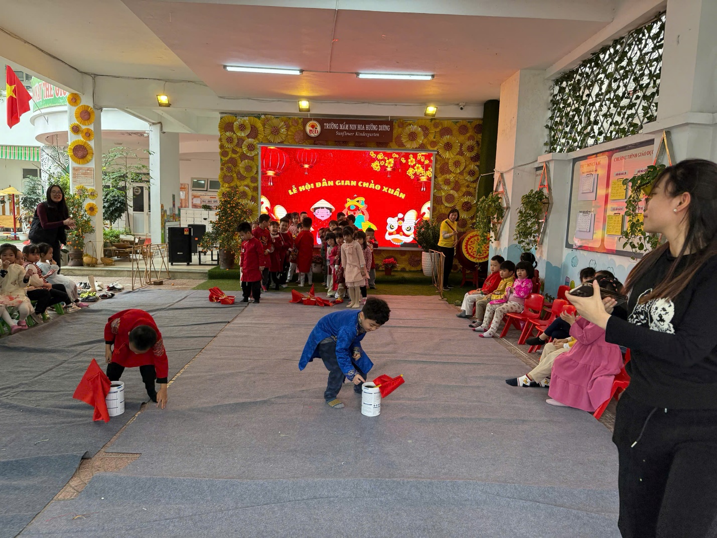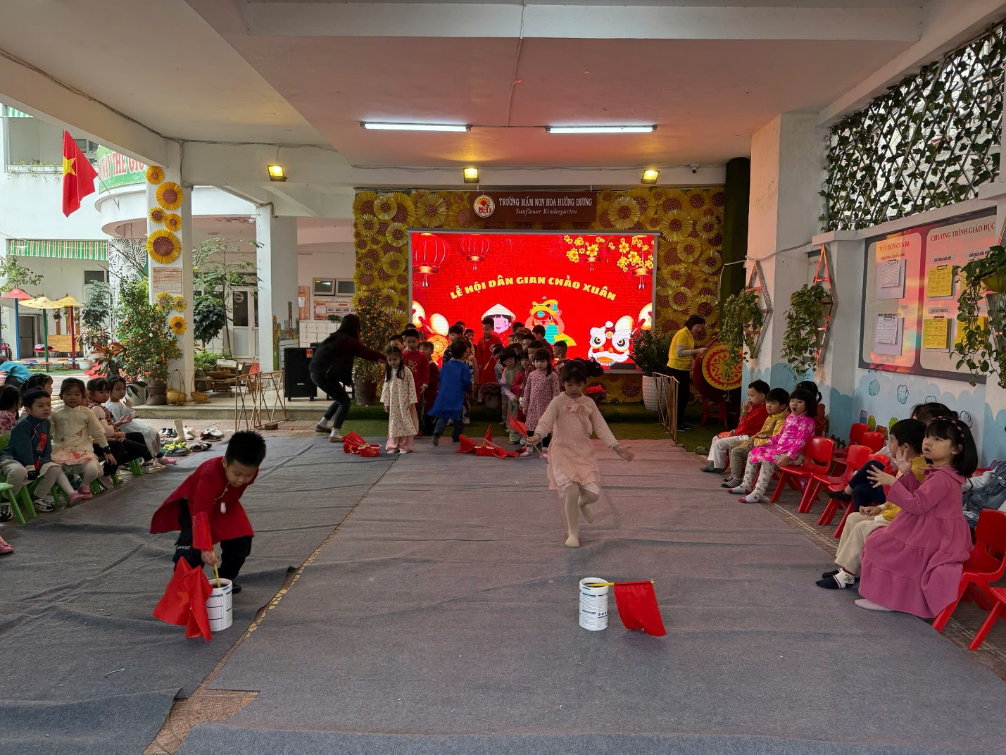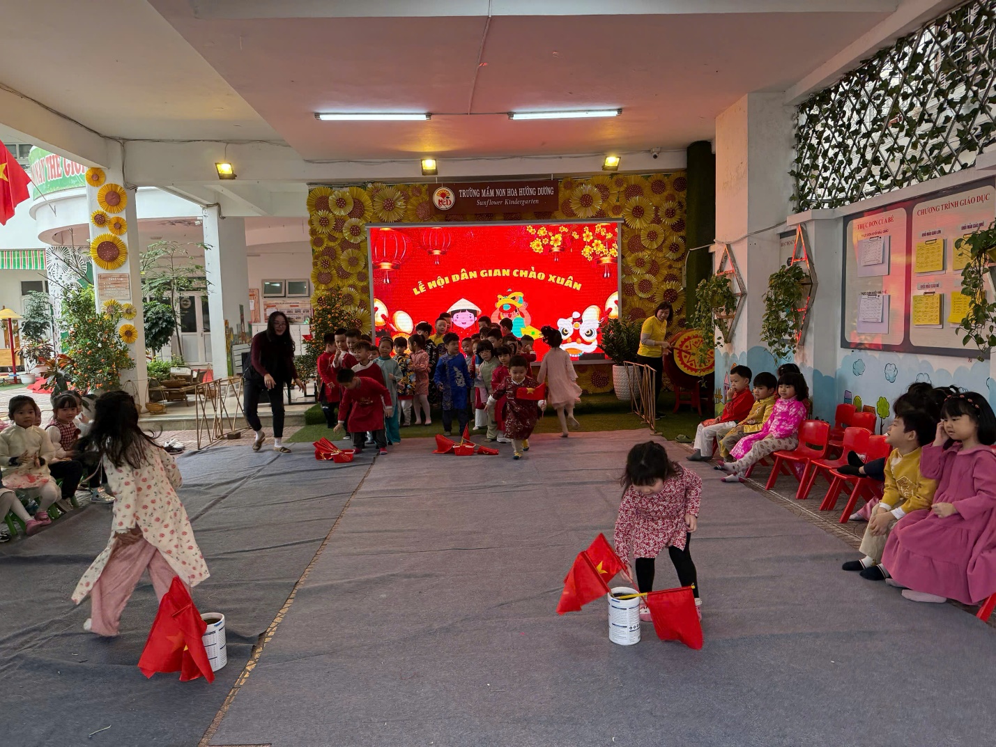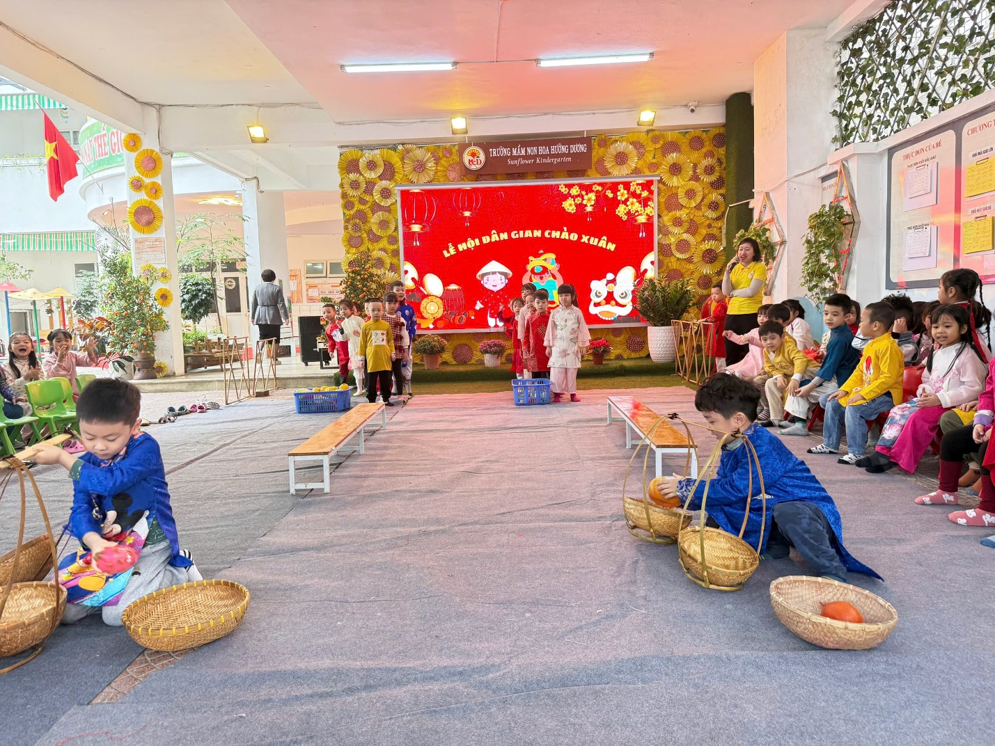 "Lễ hội chào Xuân" tại trường mầm non Hoa Hướng Dương luôn là một dịp đặc biệt và đầy ý nghĩa cho các bé cũng như các bậc phụ huynh. Đây không chỉ là cơ hội để các bé tận hưởng những trò chơi vui nhộn, các tiết mục văn nghệ, tham gia vào các hoạt động truyền thống mà còn giúp các em hiểu hơn về văn hóa dân tộc và ẩm thực các miền