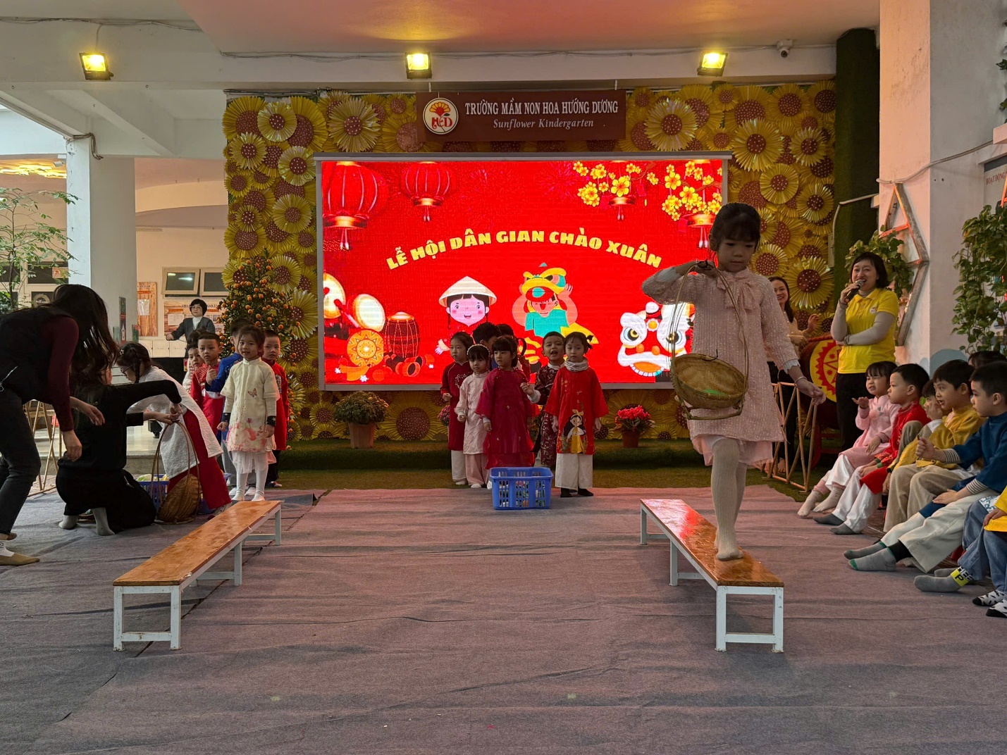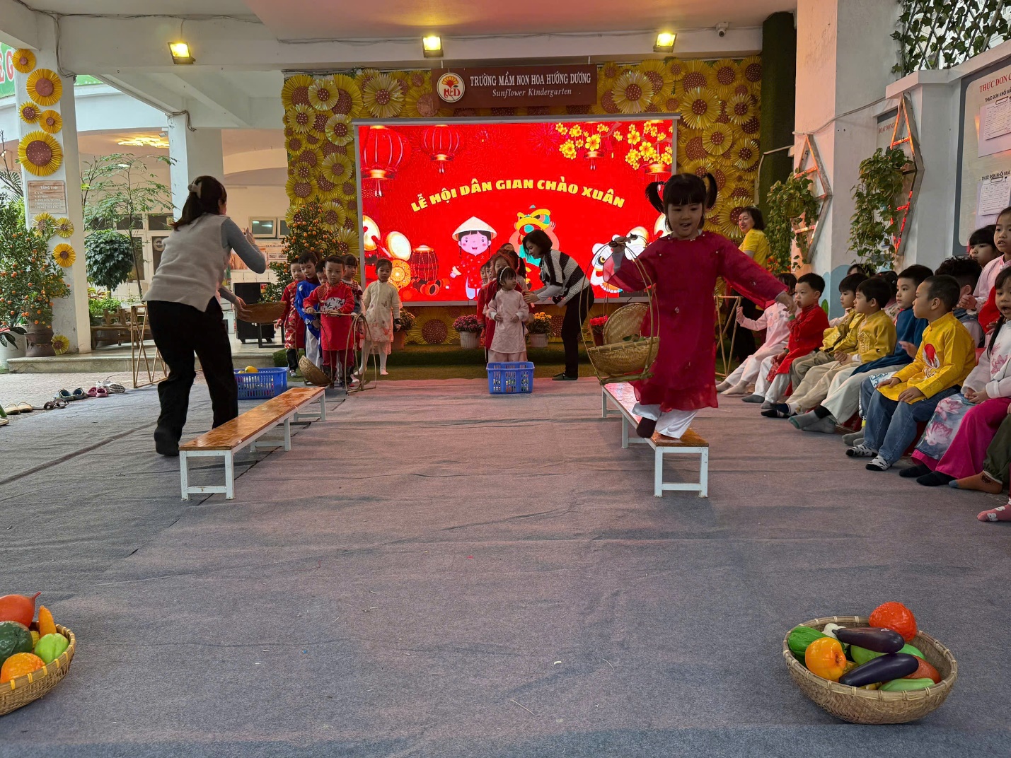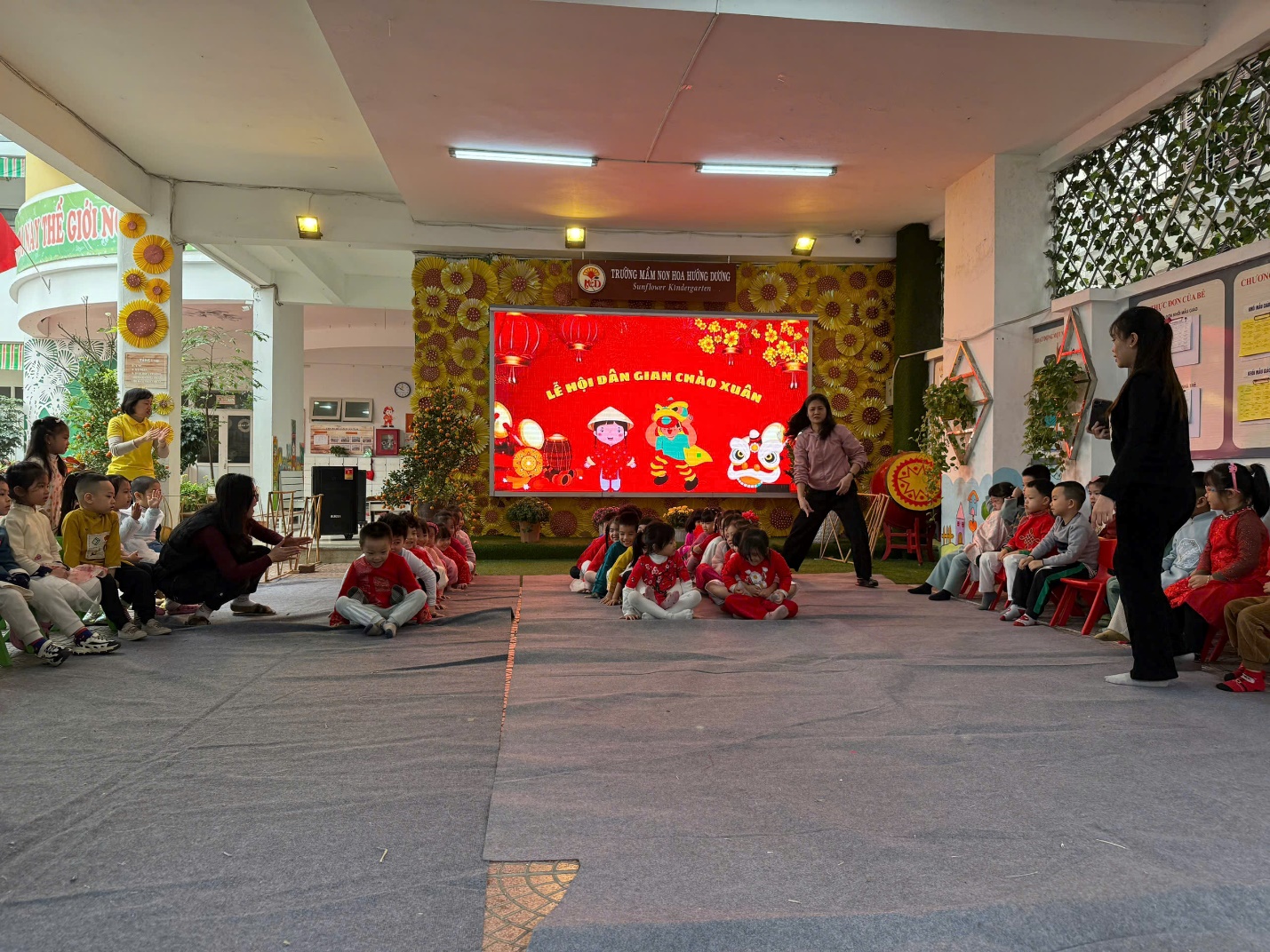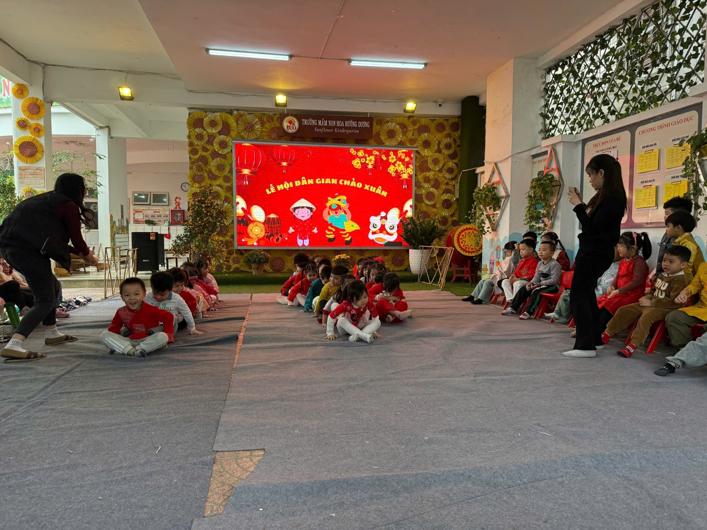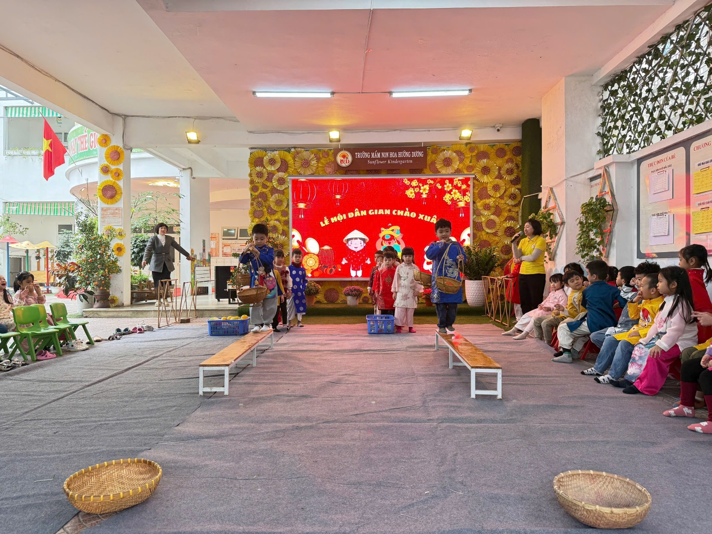 "Lễ hội chào Xuân" tại trường mầm non Hoa Hướng Dương luôn là một dịp đặc biệt và đầy ý nghĩa cho các bé cũng như các bậc phụ huynh. Đây không chỉ là cơ hội để các bé tận hưởng những trò chơi vui nhộn, các tiết mục văn nghệ, tham gia vào các hoạt động truyền thống mà còn giúp các em hiểu hơn về văn hóa dân tộc và ẩm thực các miền