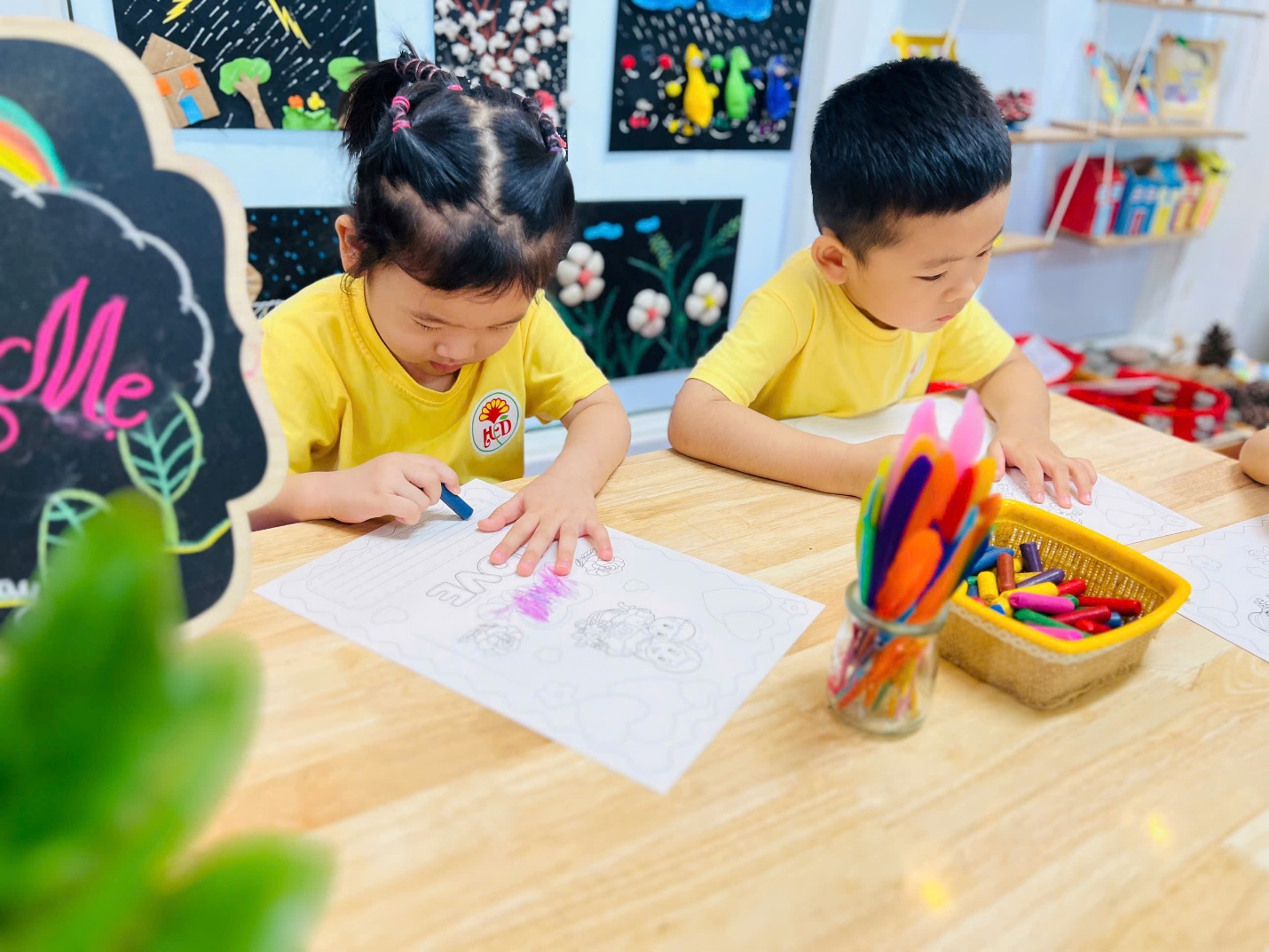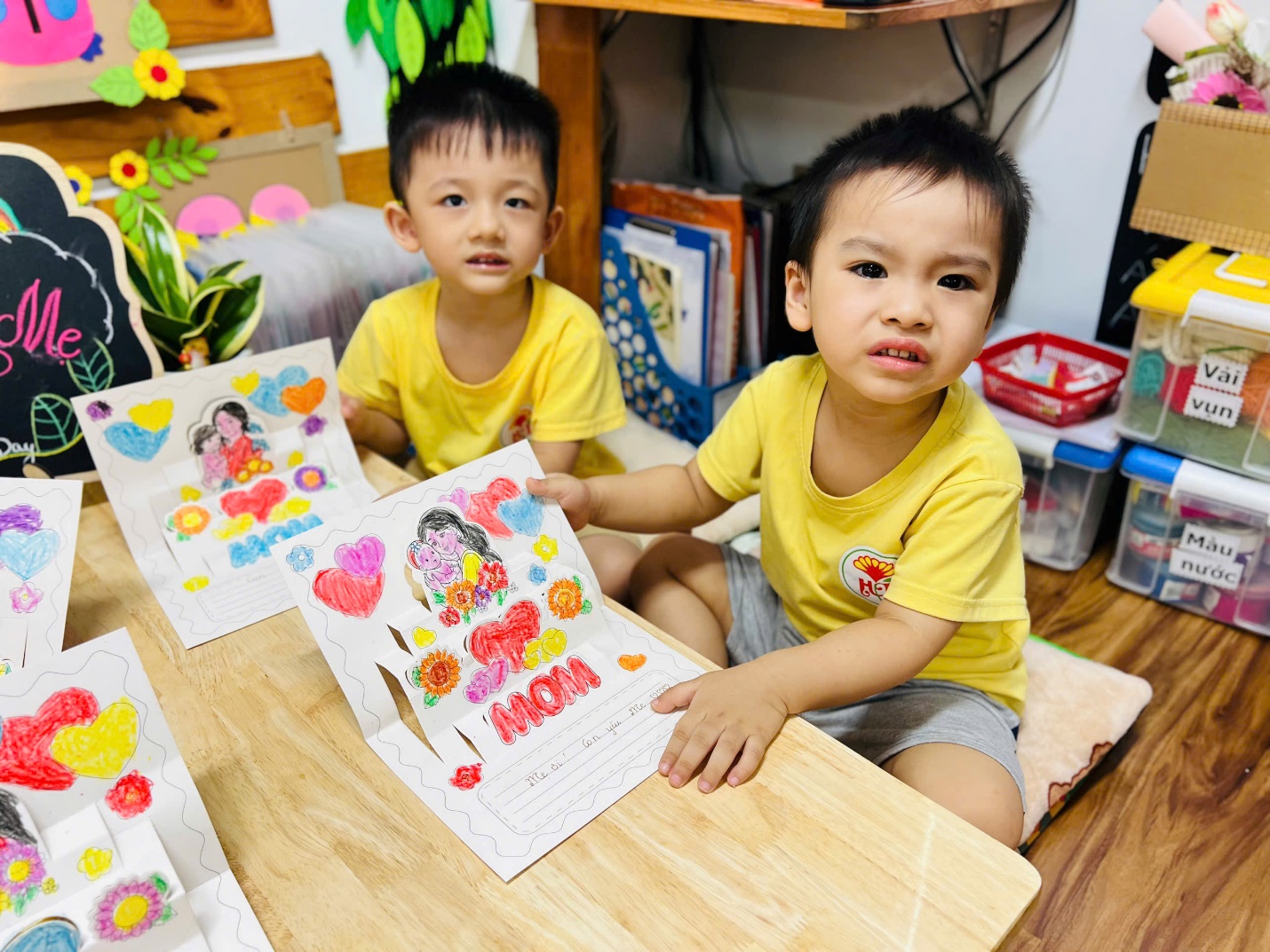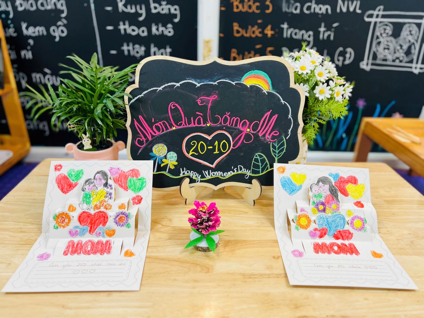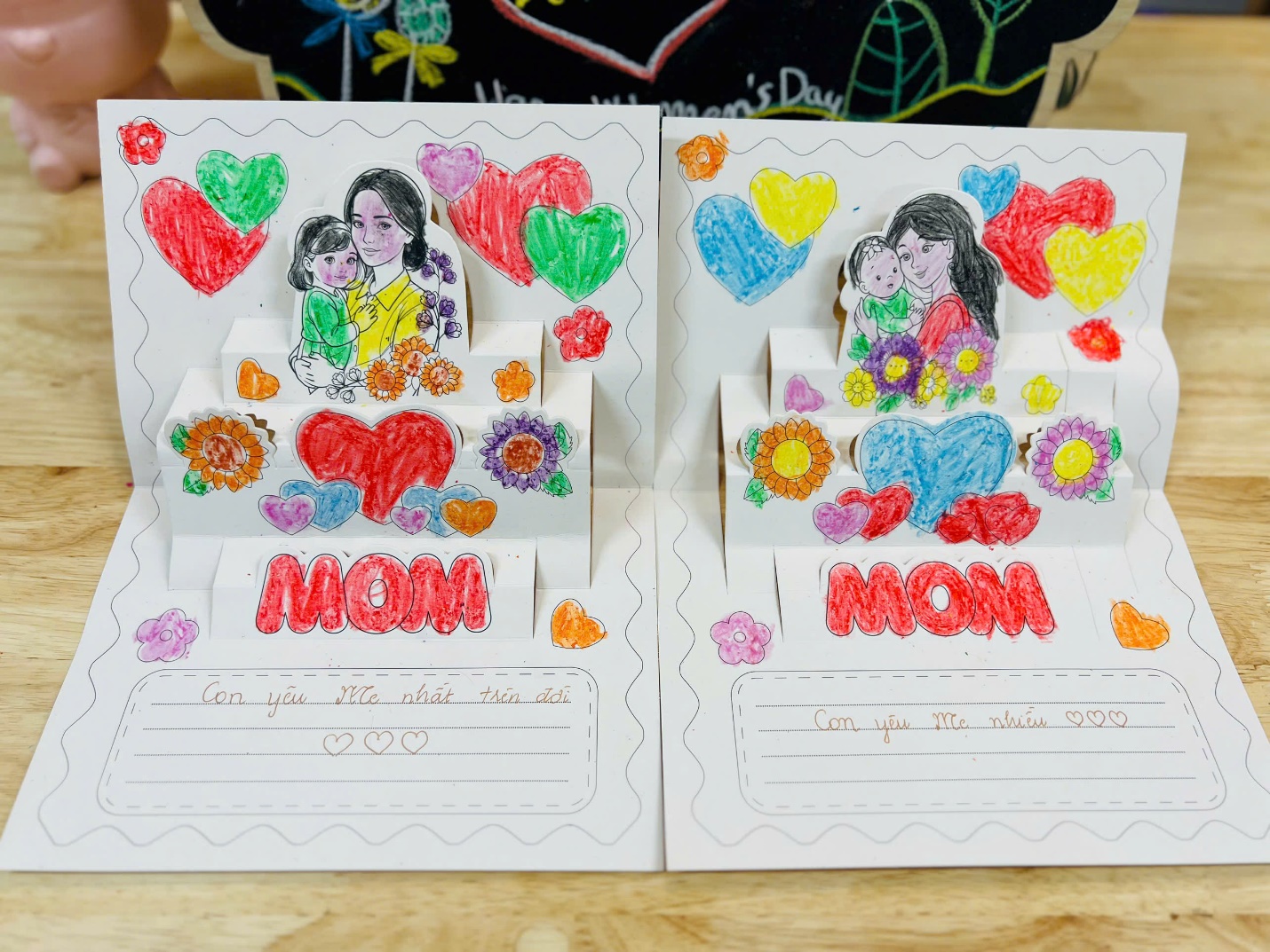 Trên mỗi tấm thiệp, các con tô màu thật khéo, nổi bật là hình ảnh “mẹ ôm con” – biểu tượng cho tình mẫu tử thiêng liêng và ấm áp. Mỗi đường cắt, mỗi nét vẽ tuy còn vụng về nhưng lại chứa chan sự chân thành và lòng biết ơn của các con gửi tới mẹ.