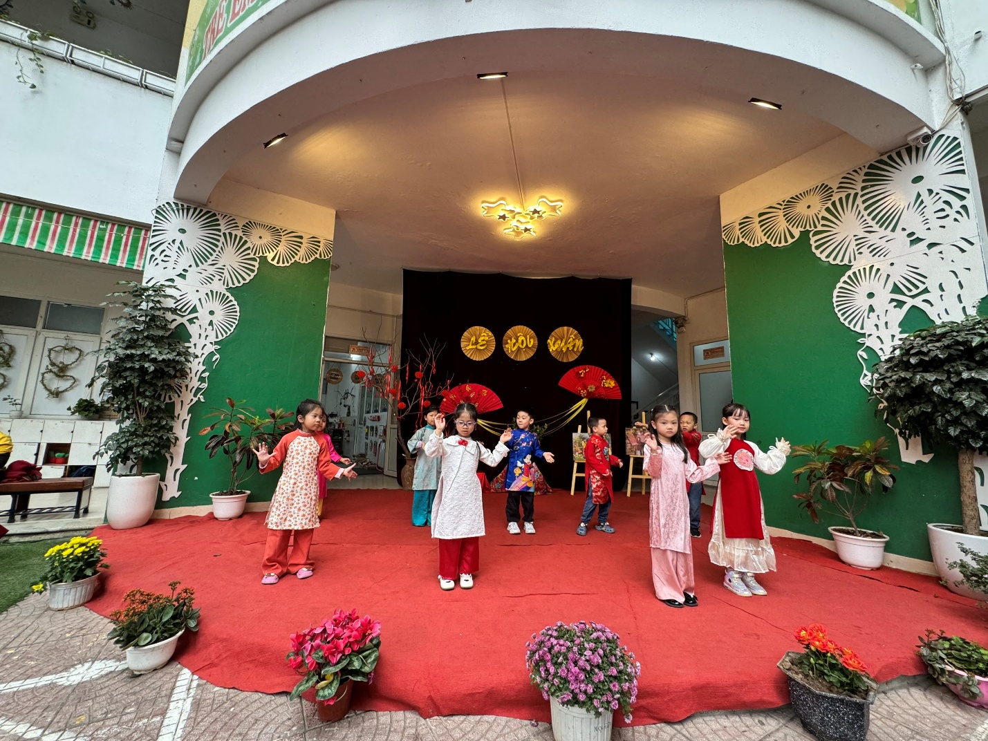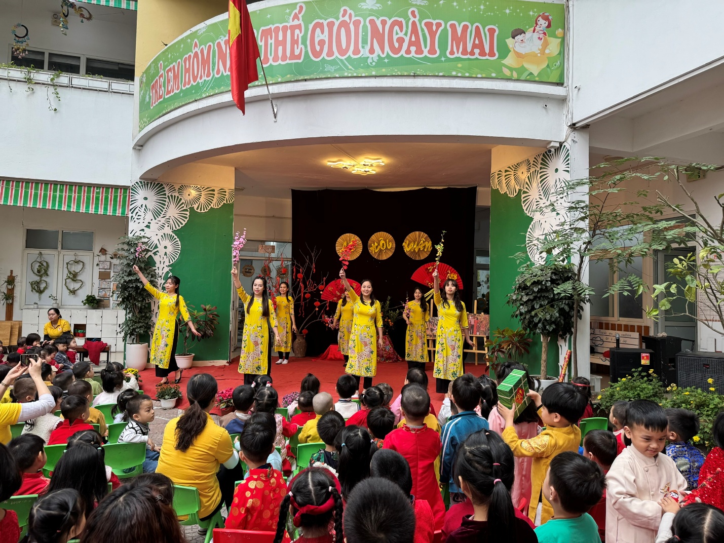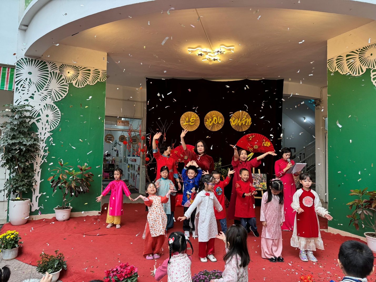 Bên cạnh những trò chơi sôi động, các bé còn có cơ hội tỏa sáng trên sân khấu với các tiết mục văn nghệ đặc sắc. Những bài hát vui tươi về mùa xuân, những điệu múa duyên dáng đầy sáng tạo đã khiến không khí lễ hội thêm phần sôi động. Dưới ánh đèn lung linh, các bé tự tin thể hiện tài năng, mang lại niềm vui và sự tự hào cho các cô, cha mẹ.