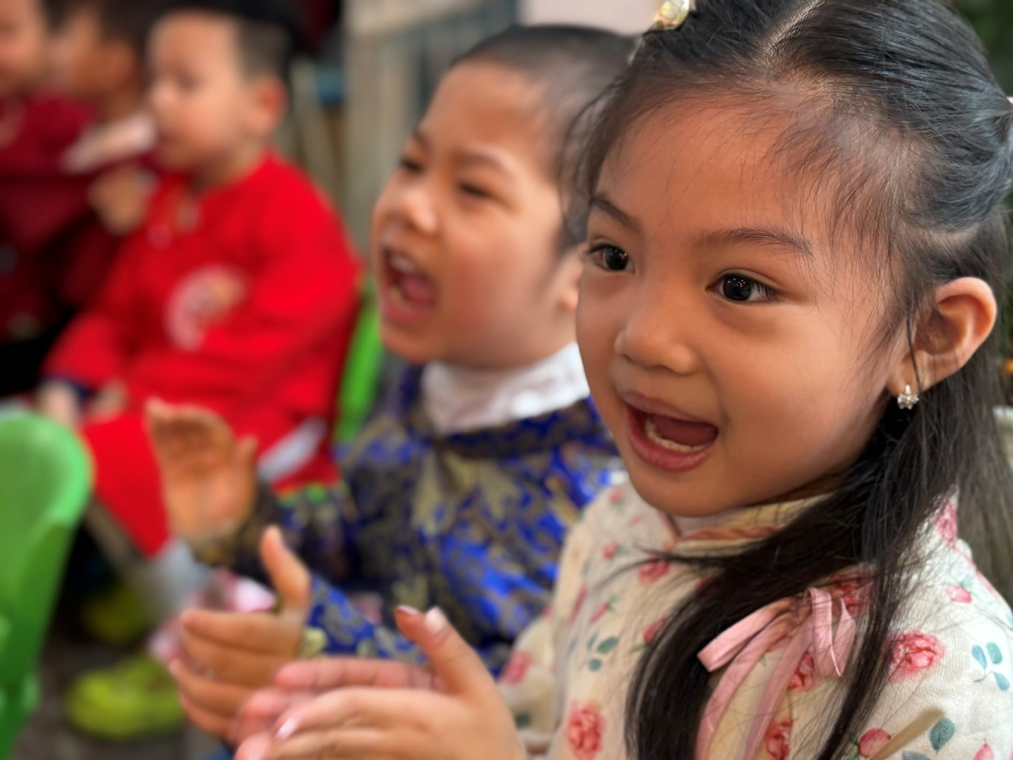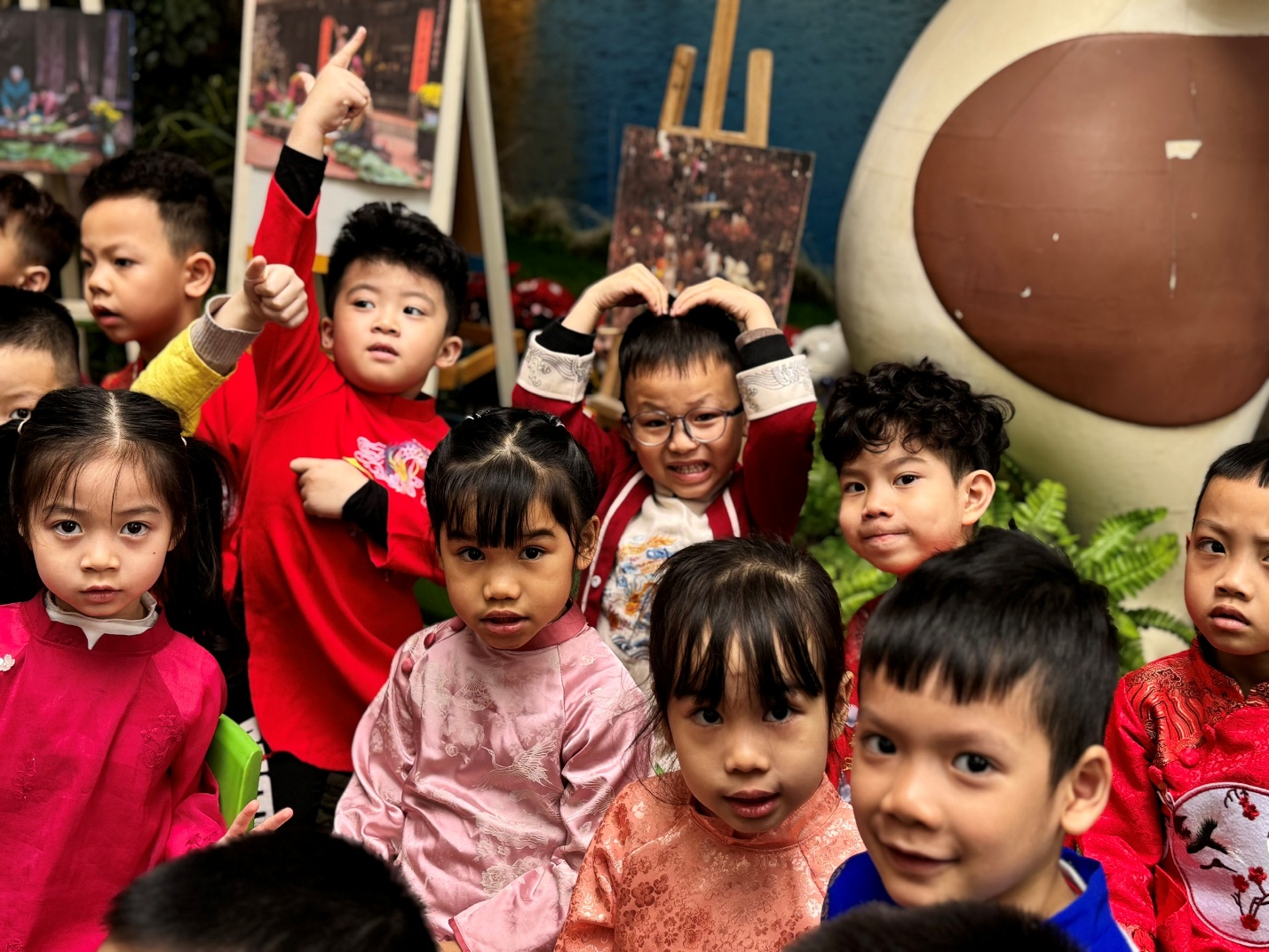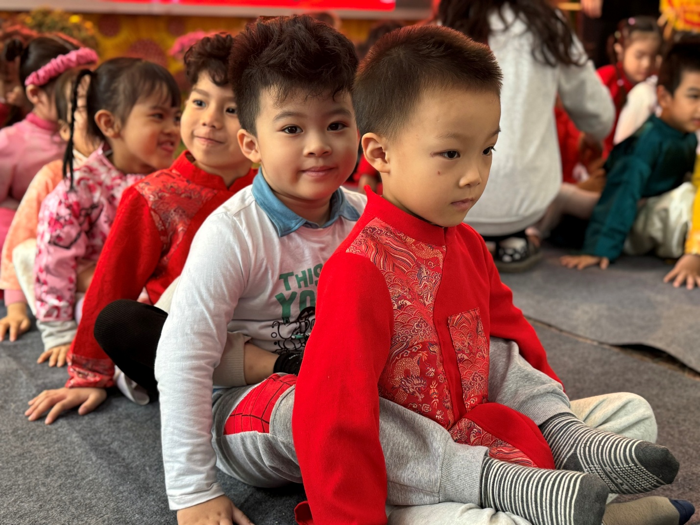 Bên cạnh những trò chơi sôi động, các bé còn có cơ hội tỏa sáng trên sân khấu với các tiết mục văn nghệ đặc sắc. Những bài hát vui tươi về mùa xuân, những điệu múa duyên dáng đầy sáng tạo đã khiến không khí lễ hội thêm phần sôi động. Dưới ánh đèn lung linh, các bé tự tin thể hiện tài năng, mang lại niềm vui và sự tự hào cho các cô, cha mẹ.