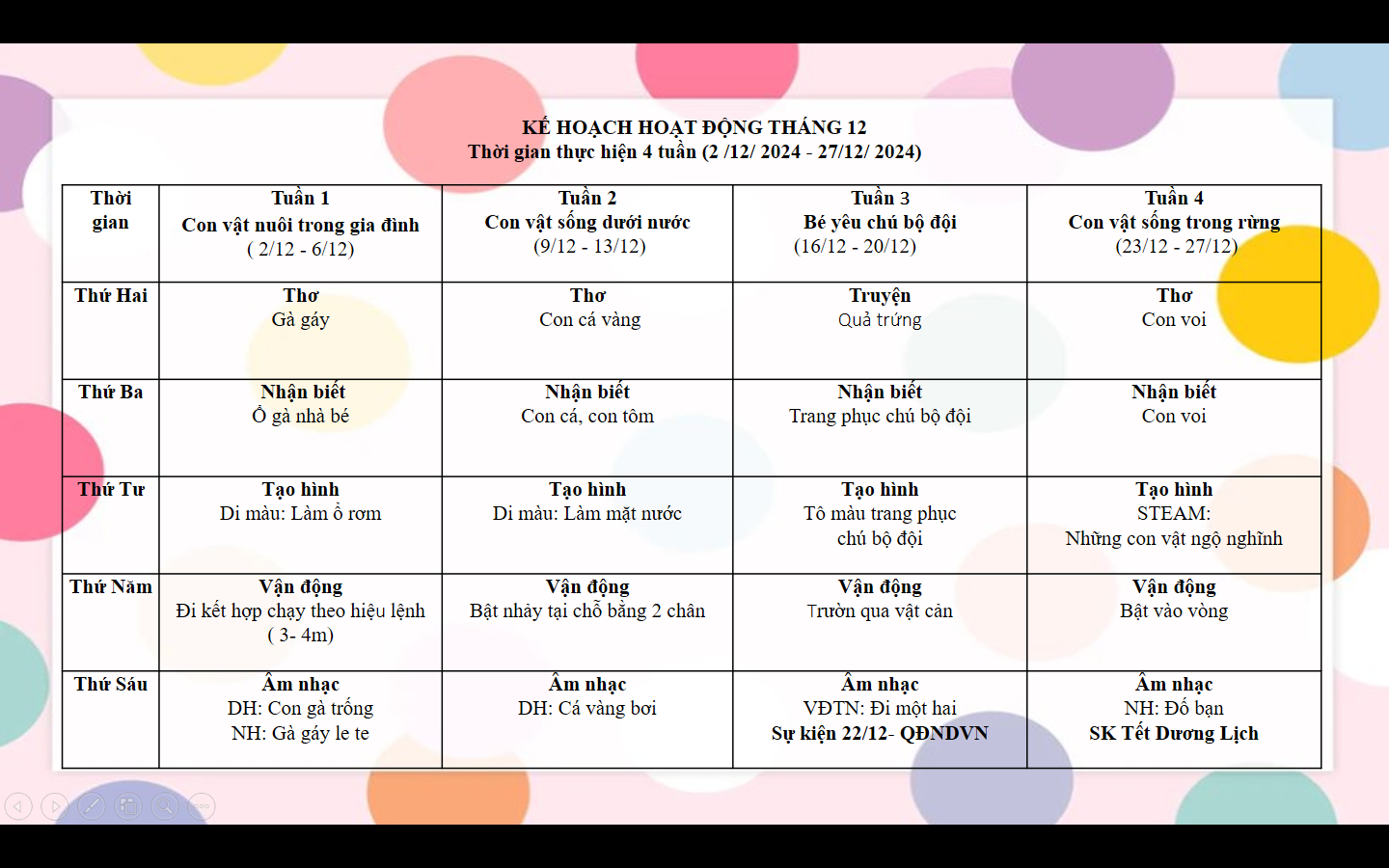 Kế hoạch hoạt động tháng 12 - Lớp Nhà trẻ D