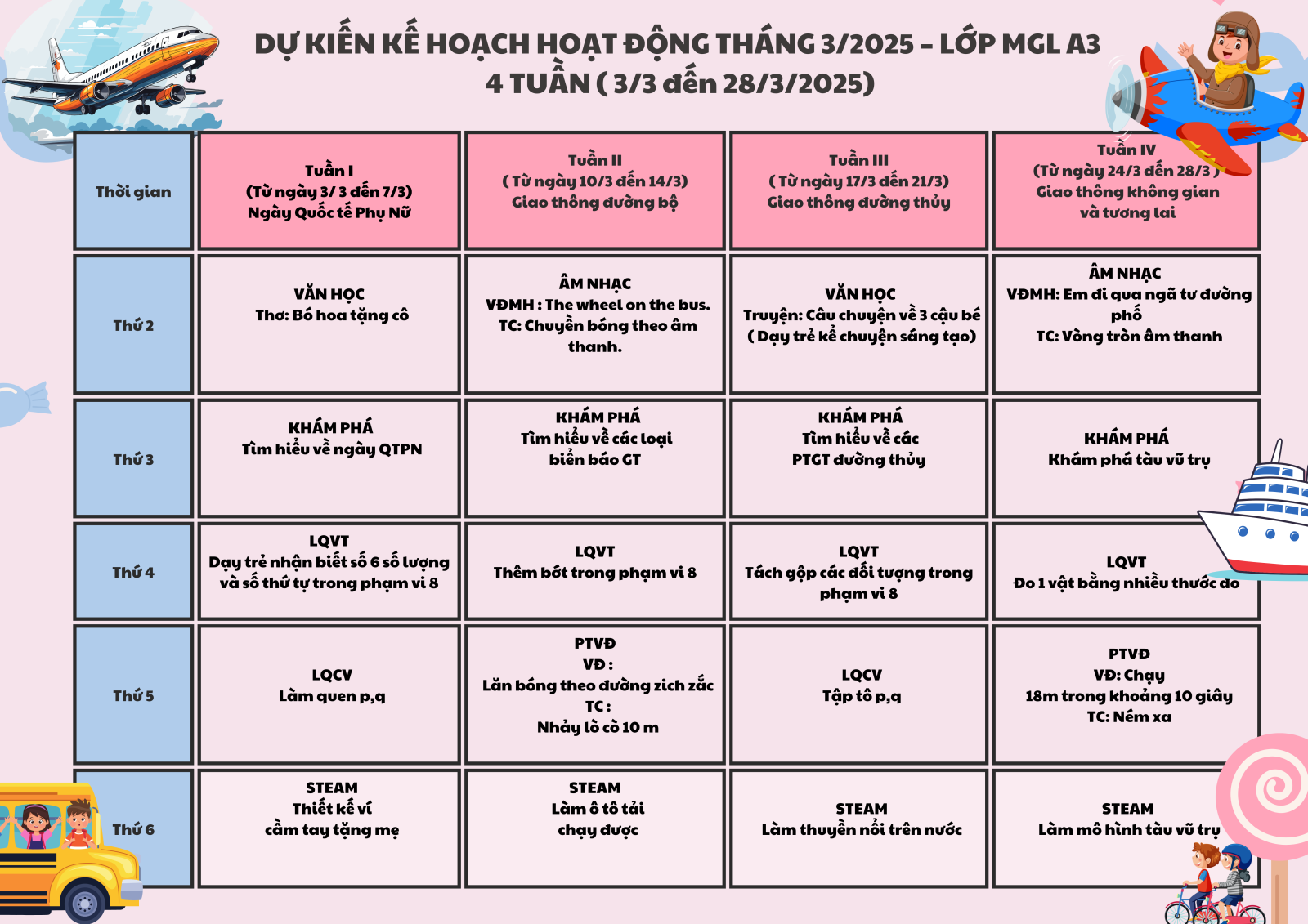 KẾ HOẠCH HOẠT ĐỘNG THÁNG 3/2025 – LỚP MẪU GIÁO LỚN A3