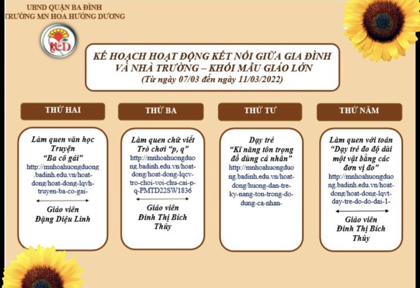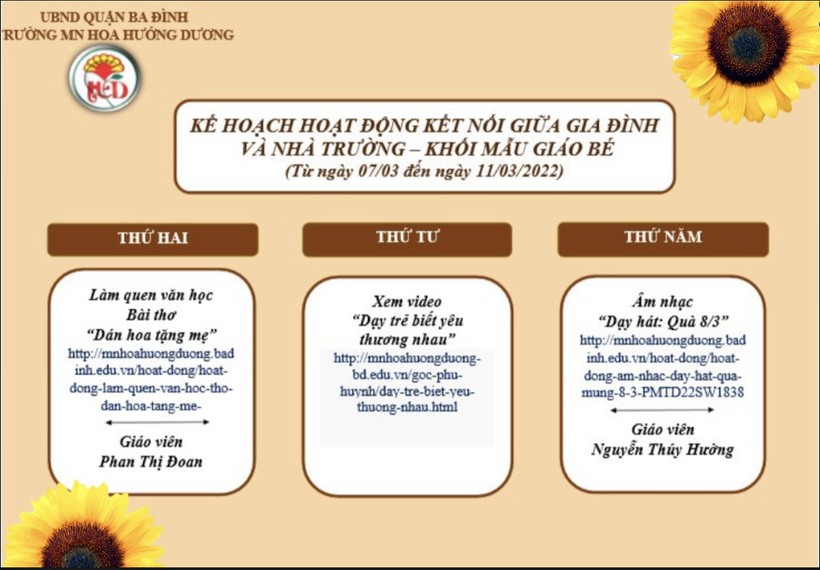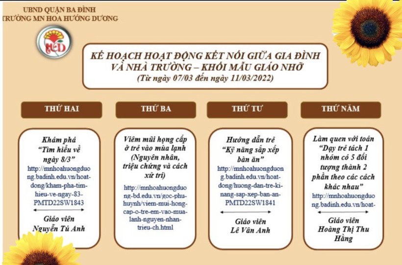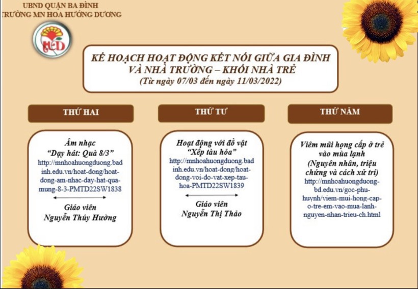 Trường Mầm non Hoa Hướng Dương xây dựng kế hoạch hoạt động kết nối với gia đình, trẻ em trong thời gian tạm dừng đến trường do dịch Covid 19 thời gian từ ngày 07/03 - 11/03/2022 để hướng dẫn cha mẹ, người chăm sóc trẻ thực hiện chế độ dinh dưỡng khoa học và tổ chức các hoạt động vui chơi tại nhà với mục đích giúp trẻ có các hoạt động bổ ích, thú vị khi ở nhà trong thời gian tạm dừng đến trường. CMHS cùng phối hợp với giáo viên, tạo điều kiện để trẻ được tham gia các hoạt động cùng cô và các bạn.