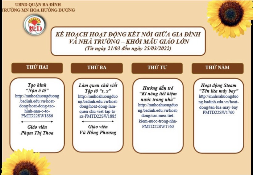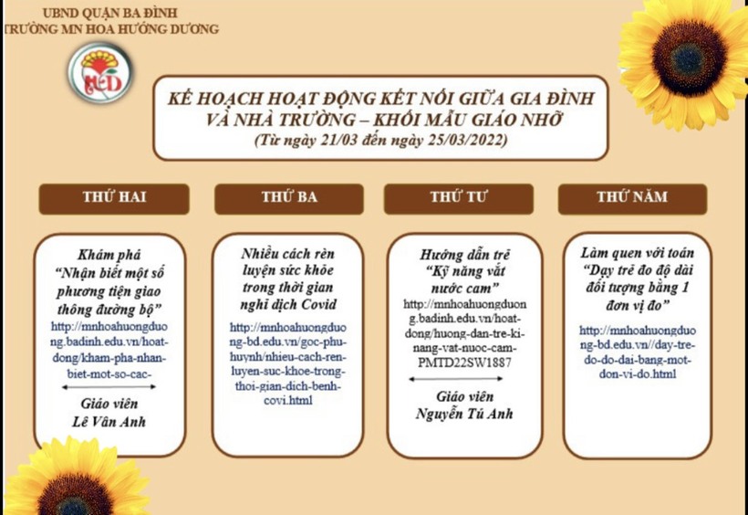 Trường Mầm non Hoa Hướng Dương xây dựng kế hoạch hoạt động kết nối với gia đình, trẻ em trong thời gian tạm dừng đến trường do dịch Covid 19 thời gian từ ngày 21/03 - 25/03/2022 để hướng dẫn cha mẹ, người chăm sóc trẻ thực hiện chế độ dinh dưỡng khoa học và tổ chức các hoạt động vui chơi tại nhà với mục đích giúp trẻ có các hoạt động bổ ích, thú vị khi ở nhà trong thời gian tạm dừng đến trường. CMHS cùng phối hợp với giáo viên, tạo điều kiện để trẻ được tham gia các hoạt động cùng cô và các bạn.