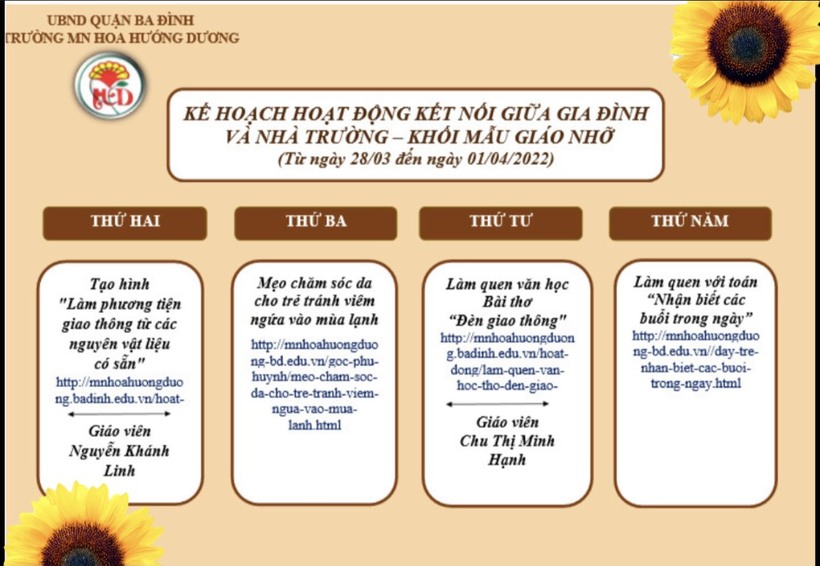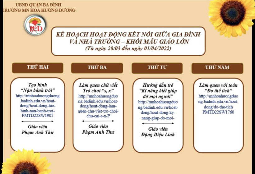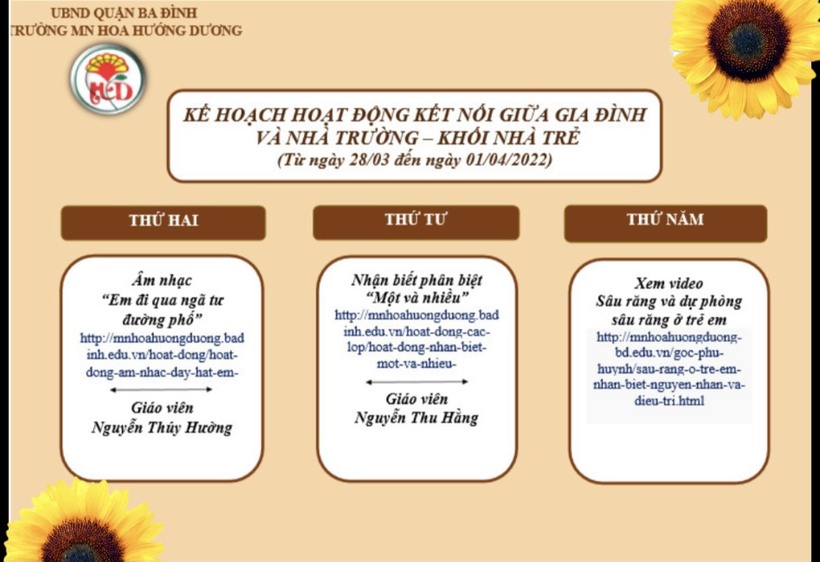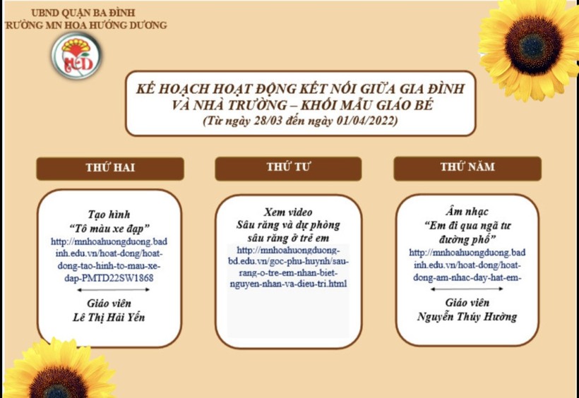 Trường Mầm non Hoa Hướng Dương xây dựng kế hoạch hoạt động kết nối với gia đình, trẻ em trong thời gian tạm dừng đến trường do dịch Covid 19 thời gian từ ngày 28/03 - 01/04/2022 để hướng dẫn cha mẹ, người chăm sóc trẻ thực hiện chế độ dinh dưỡng khoa học và tổ chức các hoạt động vui chơi tại nhà với mục đích giúp trẻ có các hoạt động bổ ích, thú vị khi ở nhà trong thời gian tạm dừng đến trường. CMHS cùng phối hợp với giáo viên, tạo điều kiện để trẻ được tham gia các hoạt động cùng cô và các bạn.