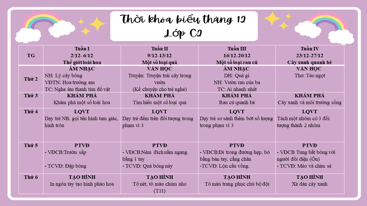 Thời khóa biểu tháng 12 - Lớp Mẫu giáo bé C2
