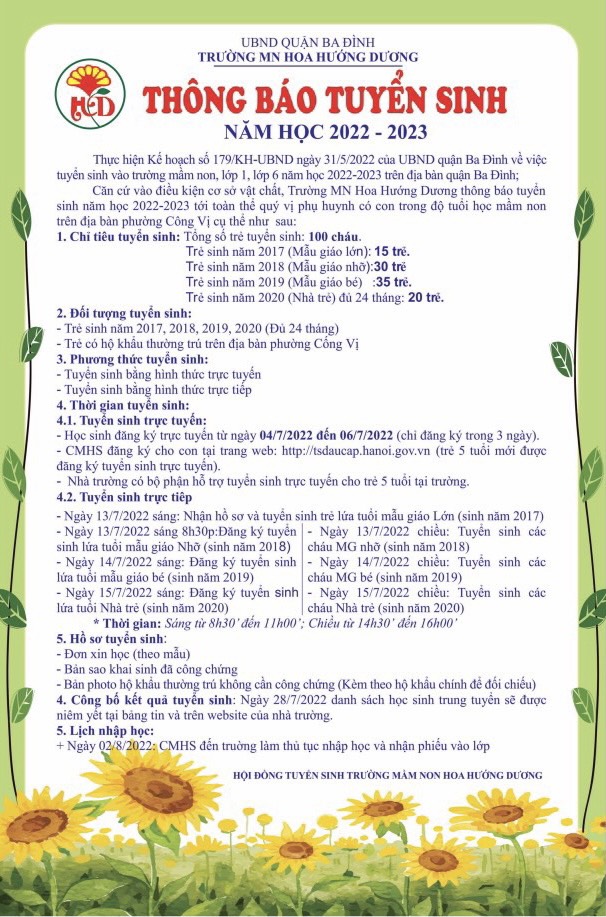Thông báo tuyển sinh Trường Mầm non Hoa Hướng Dương, năm học 2022 – 2023