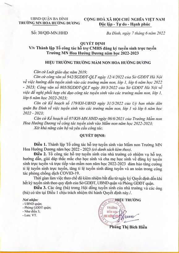 Thực hiện chỉ đạo của UBND Thành phố Hà Nội về công tác tuyển sinh đầu cấp, sáng ngày 04/07/2022, trường Mầm non Hoa Hướng Dương tiến hành “Công tác tuyển sinh trực tuyến từ ngày 04/07/2022-06/07/2022 năm học 2022 - 2023” trên cổng thông tin tuyển sinh đầu cấp tại địa chỉ http://tsdaucap.hanoi.gov.vn