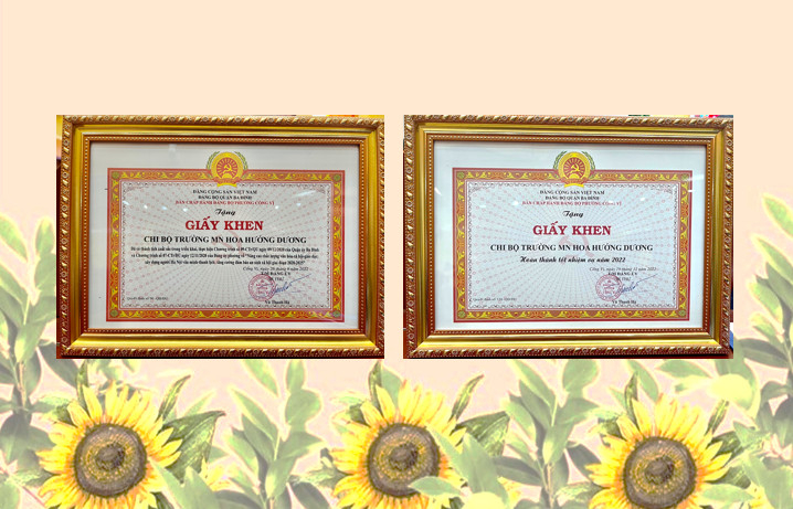 Ngày 30/01/2023, Đảng ủy - UBND phường Cống Vị long trọng tổ chức Hội nghị Sơ kết giữa nhiệm kỳ triển khai thực hiện Nghị quyết Đại hội Đảng Bộ phường Cống Vị lần thứ XIII (nhiệm kỳ 2020-2025); Tổng kết công tác xây dựng Đảng năm 2022 và Triển khai nhiệm vụ trọng tâm năm 2023. Chi bộ trường trường MN Hoa Hướng Dương cũng rất vinh dự được Ban chấp hành Đảng bộ phường Cống Vị tặng giấy khen: Chi bộ có thành tích xuất sắc trong triển khai thực hiện Chương trình số 09-CTr/QU ngày 19/12/2020 của Quận ủy Ba Đình và Chương trình số 07-CTr/QU ngày 12/11/2020 của Đảng ủy phường về “Nâng cao chất lượng văn hóa-xã hội-giáo dục; xây dựng người Hà Nội văn minh thanh lịch; tăng cường đảm bảo an sinh xã hội giai đoạn 2022-2025”; Chi bộ Hoàn thành tốt nhiệm vụ năm 2022;