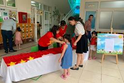 Chi đoàn trường Mầm non Hoa Hướng Dương tổ chức bán áo cờ đỏ sao vàng cho các bé tại sân khấu trường