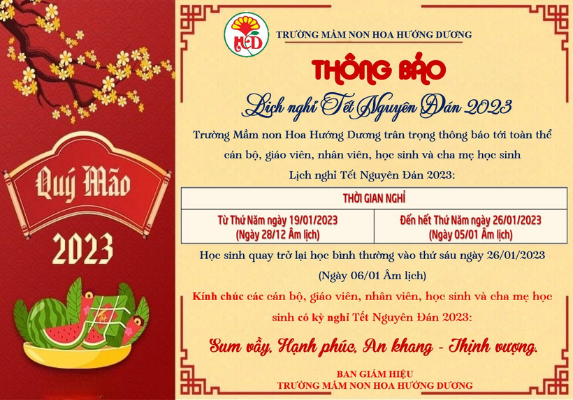 Trường Mầm non Hoa Hướng Dương thông báo lịch nghỉ Tết Nguyên Đán 2023.