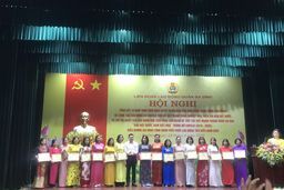 Đồng chí Nguyễn Xuân Trọng - Chủ tịch LĐLĐ quận Ba Đình trao tặng giấy khen cho các cô giáo tại Hội nghị biểu dương