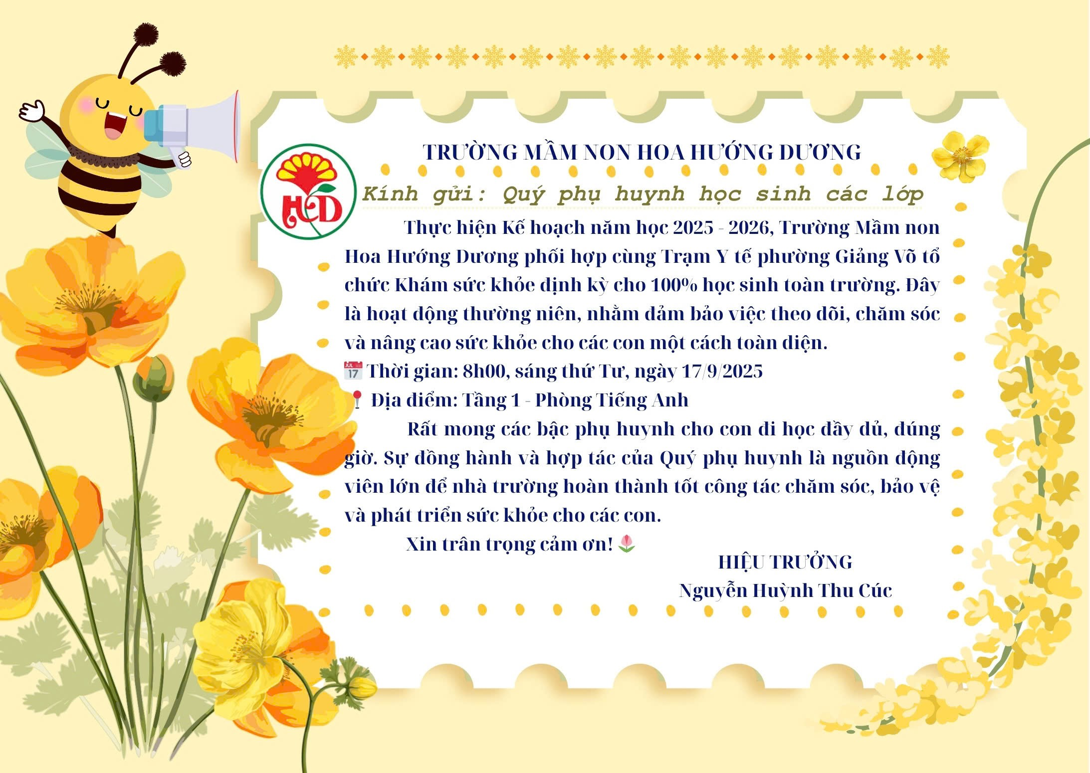 Rất mong các bậc phụ huynh cho con đi học đầy dủ, đúng giờ. Sự đồng hành và hợp tác của Quý phụ huynh là nguồn động viên lớn để nhà trường hoàn thành tốt công tác chăm sóc, bảo vệ và phát triển sức khỏe cho các con.