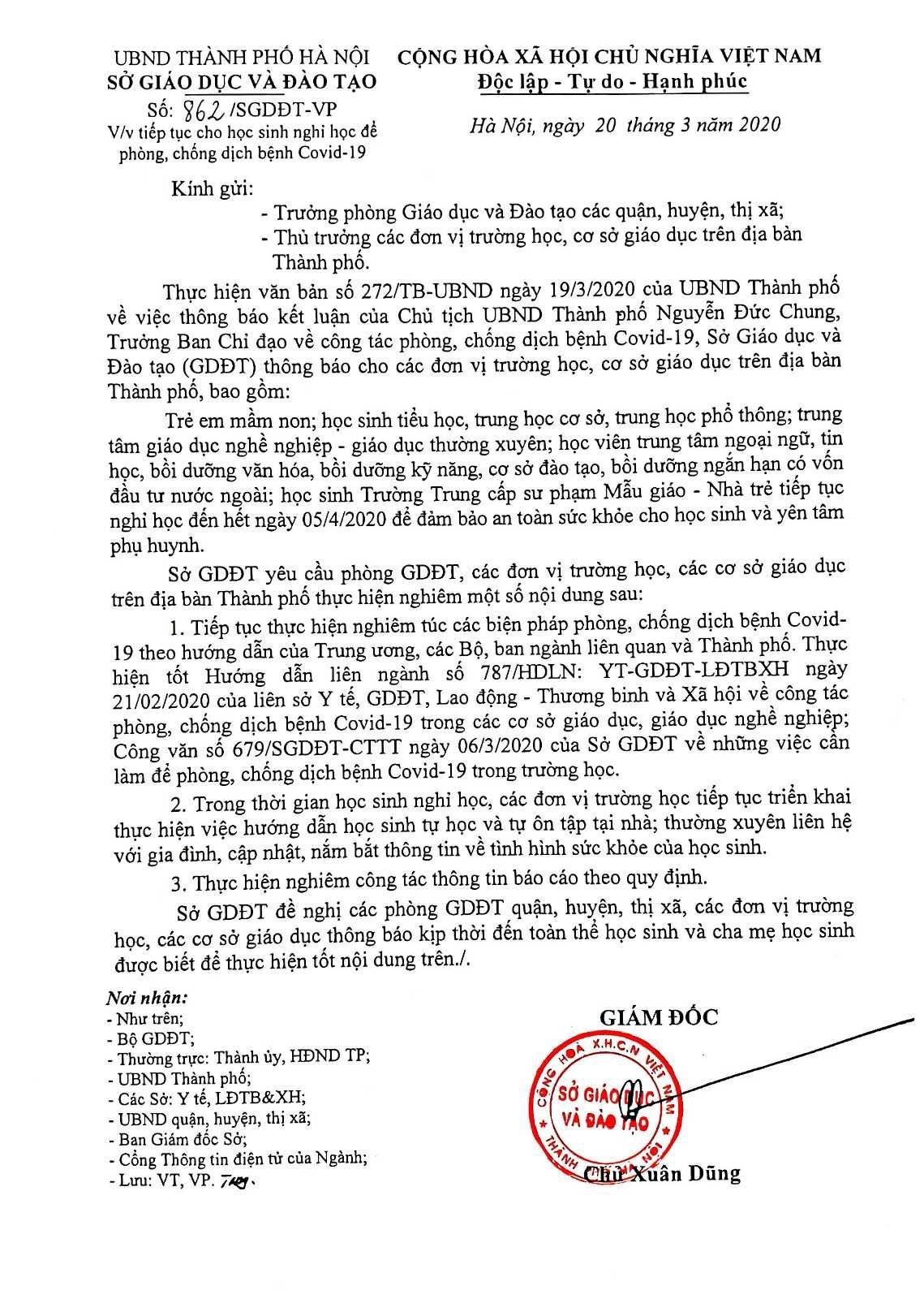 Căn cứ Công văn số 862/SGDĐT-VP ngày 20/3/2020 của Sở Giáo dục và Đào tạo Hà Nội về việc tiếp tục cho học sinh nghỉ học nhằm bảo đảm công tác phòng, chống dịch bệnh Covid-19;
