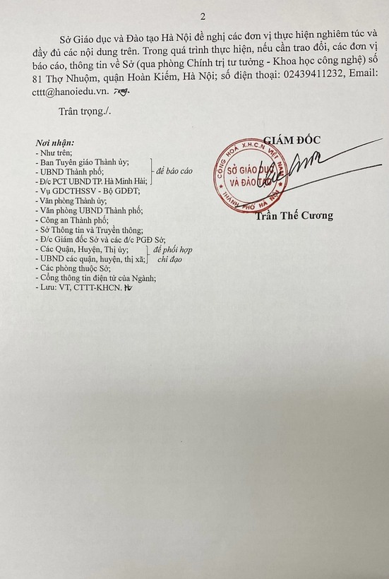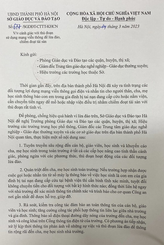 Ngày 14/03/2023, Sở GDĐT Hà Nội ra công văn số 677/SGDĐT-CTTT-KHCN về việc cảnh giác với thủ đoạn sử dụng mạng viễn thông để lừa đảo, chiếm đoạt tài sản.