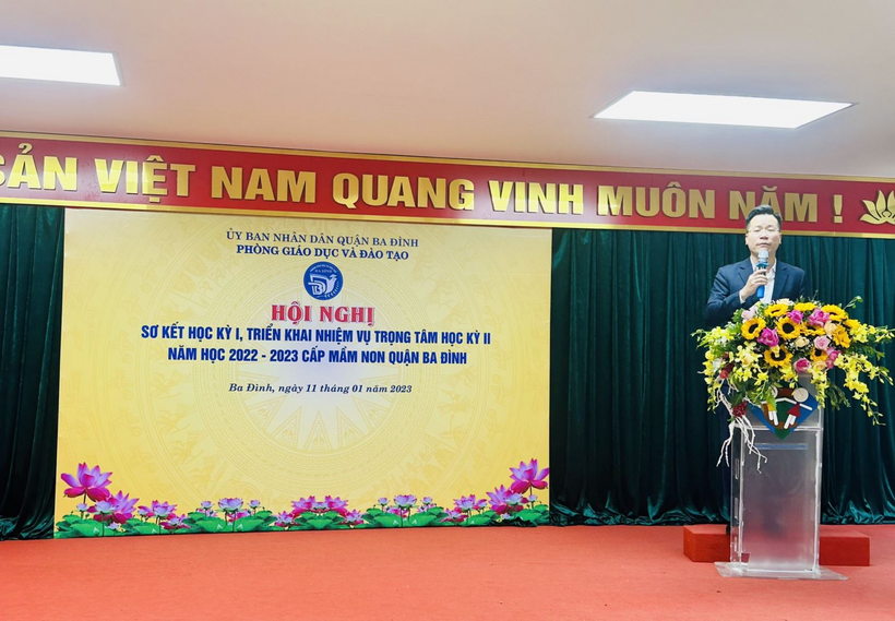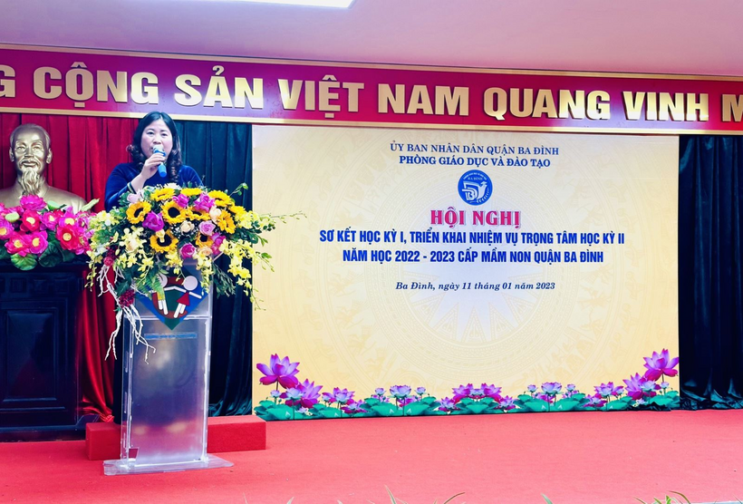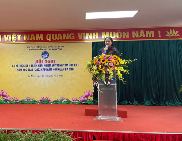 Tại hội nghị, bà Trần Thị Vinh - Phó Trưởng phòng GD-ĐT quận Ba Đình đã báo cáo sơ kết học kỳ I và triển khai nhiệm vụ học kỳ II năm học 2022 - 2023 cấp học Mầm non. Trong báo cáo, bà Trần Thị Vinh cũng đã có những nhận định khen ngợi tập thể trường Mầm non Hoa Hướng Dương trong công tác nuôi dưỡng, đảm bảo an toàn thực phẩm trong trường học, bồi dưỡng các chuyên đề nâng cao chuyên môn cho giáo viên, đặc biệt là phát triển mạnh công tác truyền thông trong nhà trường.
