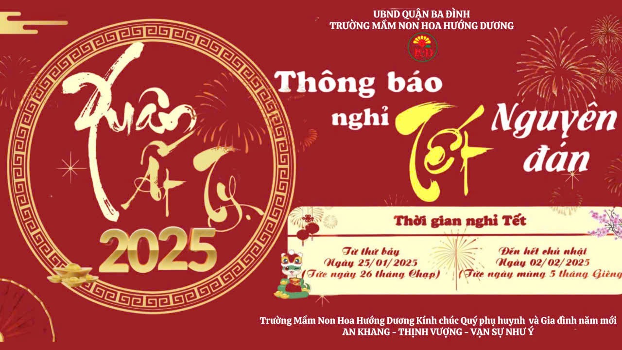 Trường Mầm non Hoa Hướng Dương xin thông báo lịch nghỉ tết Nguyên đán - đón Xuân Ất Tỵ 2025 tới toàn thể CB-GV-NV và các bậc cha mẹ học sinh lịch cụ thể như sau: