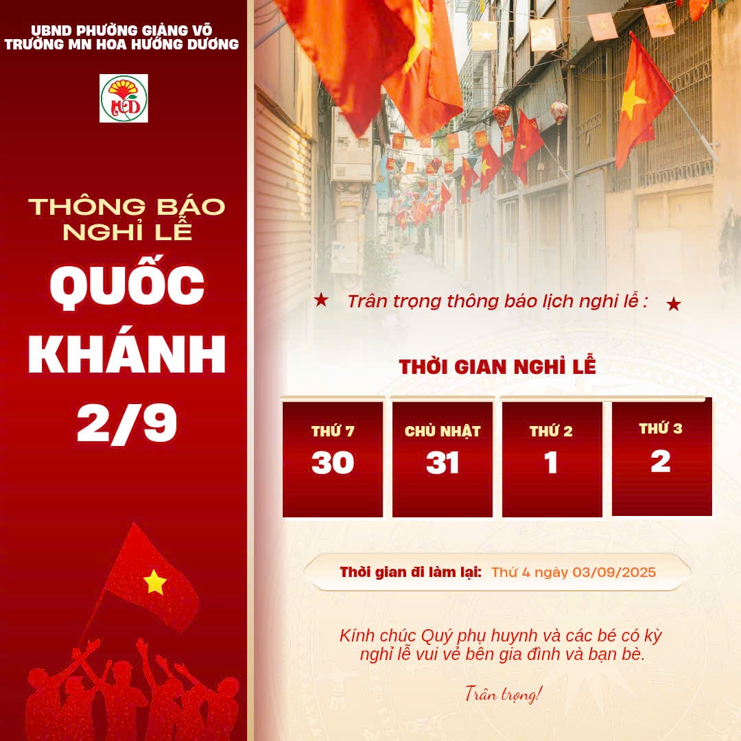 Trường Mầm non Hoa Hướng Dương thông báo lịch nghỉ lễ Quốc khánh 2/9