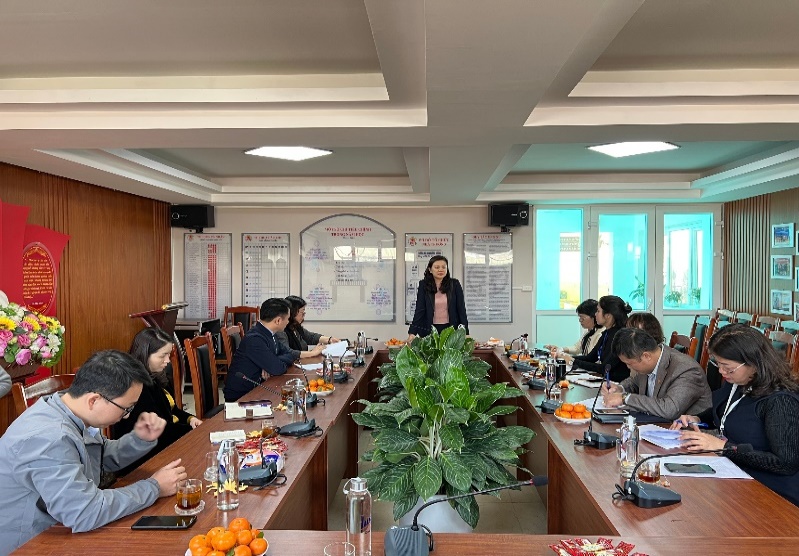 Đồng chí Trần Thị Vinh báo cáo đoàn về công tác bảo đảm an toàn thực phẩm bếp ăn tập thể trường học tại các cơ sở giáo dục trên địa bàn quận Ba Đình