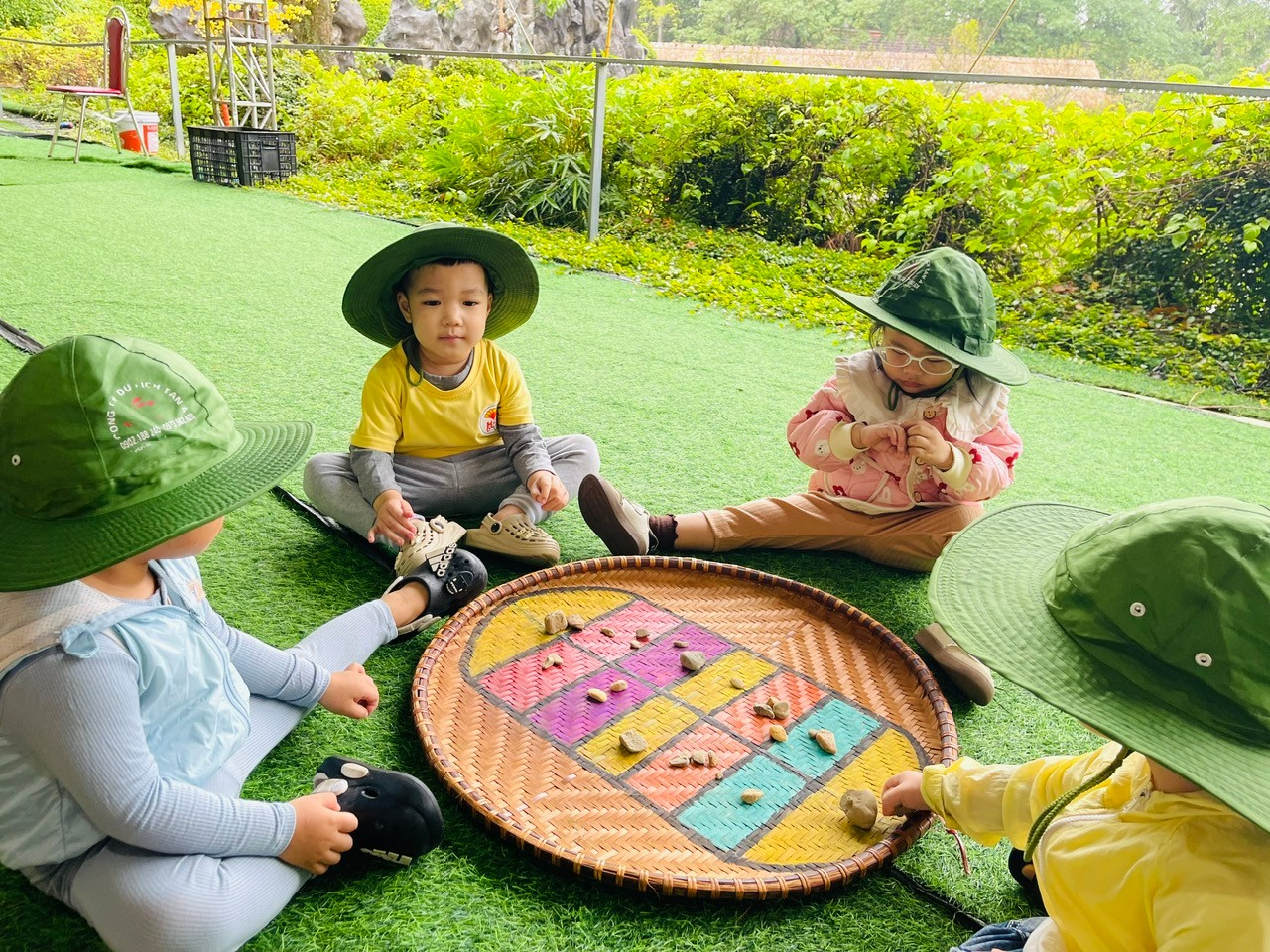 Ô Ăn Quan và Vận động nhẹ nhàng: Các con thích thú ngồi vây quanh bàn cờ ô ăn quan. Hoạt động này không chỉ rèn luyện tư duy sơ khởi mà còn giúp bé học cách chờ đợi, luân phiên và tương tác nhóm.