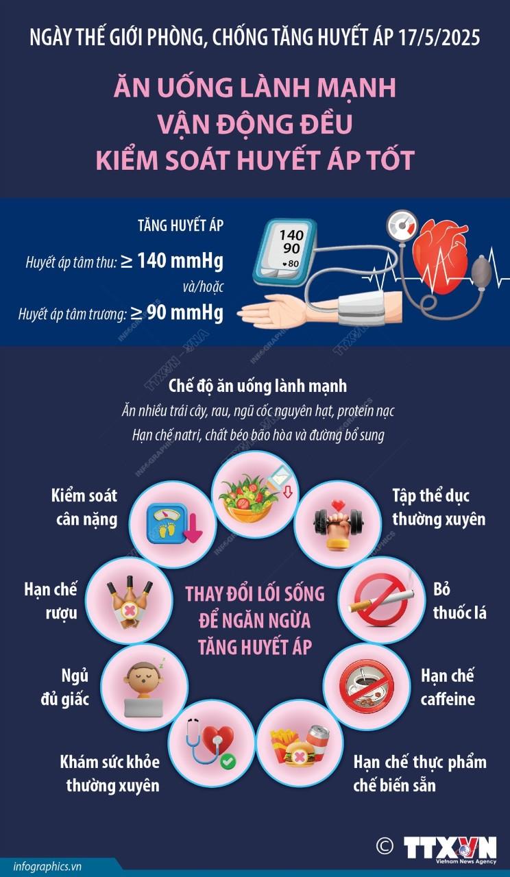 Năm 2025, chủ đề của Ngày thế giới phòng, chống tăng huyết áp là “Ăn uống lành mạnh - Vận động đều - Kiểm soát huyết áp tốt”. Mọi người có thể giảm đáng kể nguy cơ tăng huyết áp bằng cách áp dụng chế độ ăn uống cân bằng, tập thể dục thường xuyên và thực hiện những thay đổi nhỏ trong thói quen hàng ngày.
