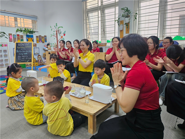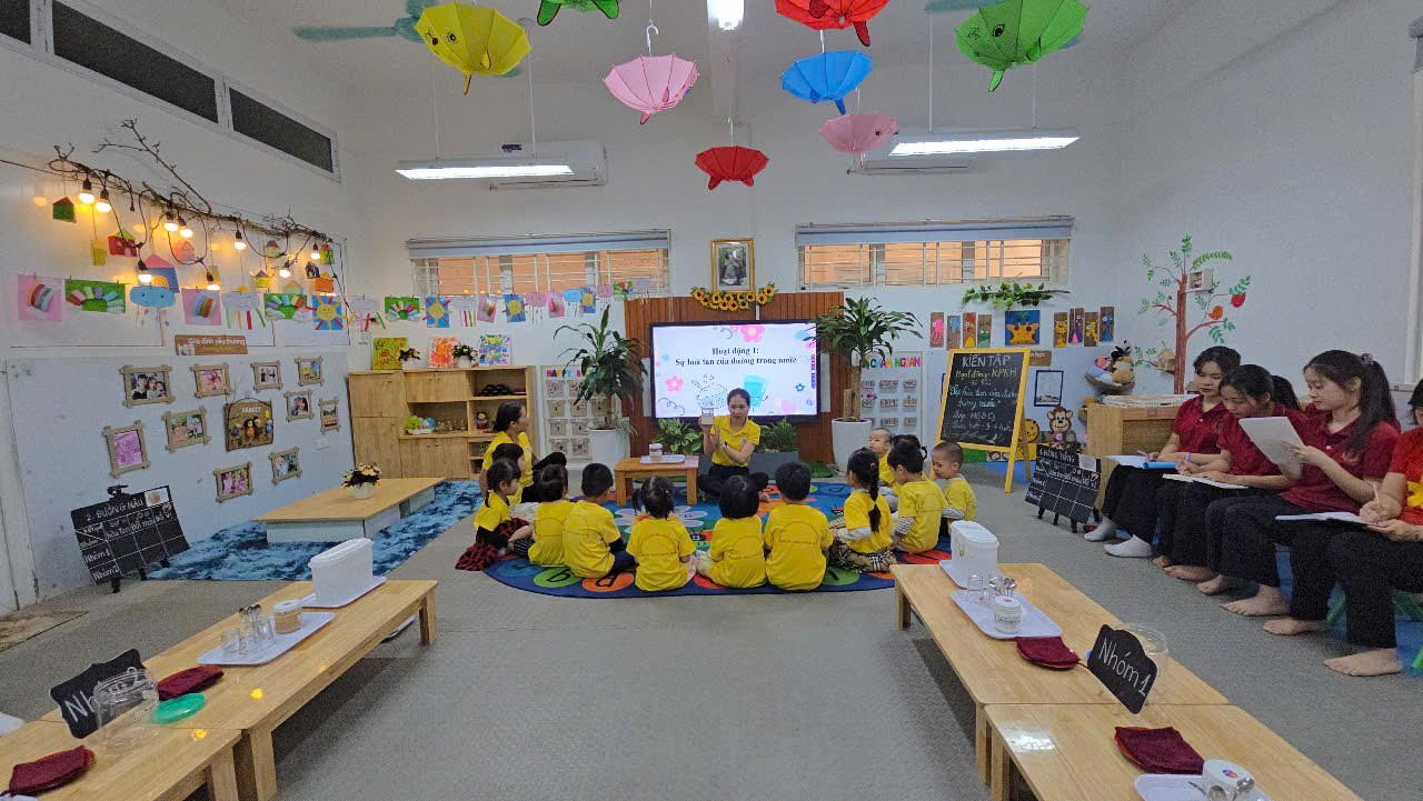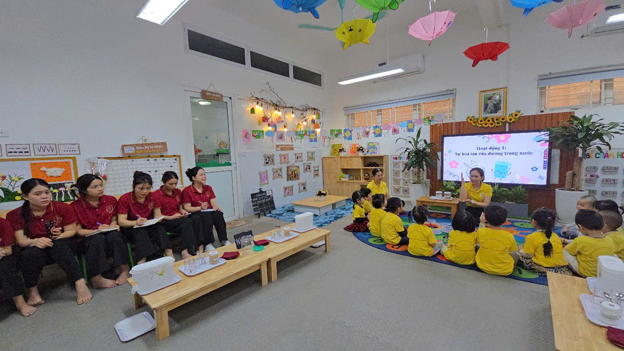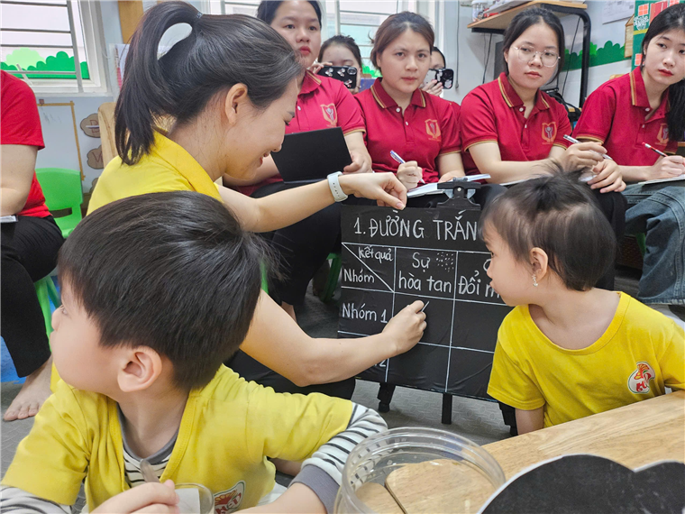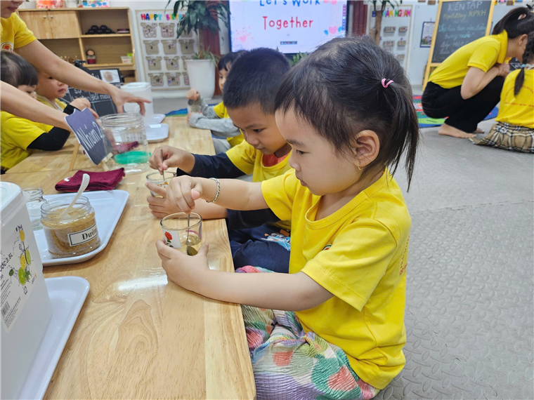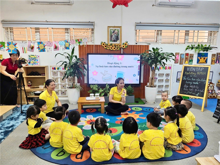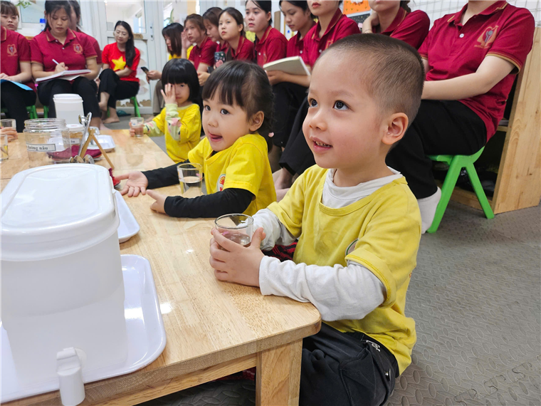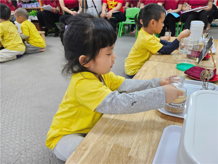 Qua hoạt động, các bé không chỉ hiểu được quá trình hòa tan mà còn rèn luyện kỹ năng quan sát và diễn đạt. Những tiếng reo hò thích thú khi đường "biến mất" đã tạo nên một buổi học đầy niềm vui và bổ ích.