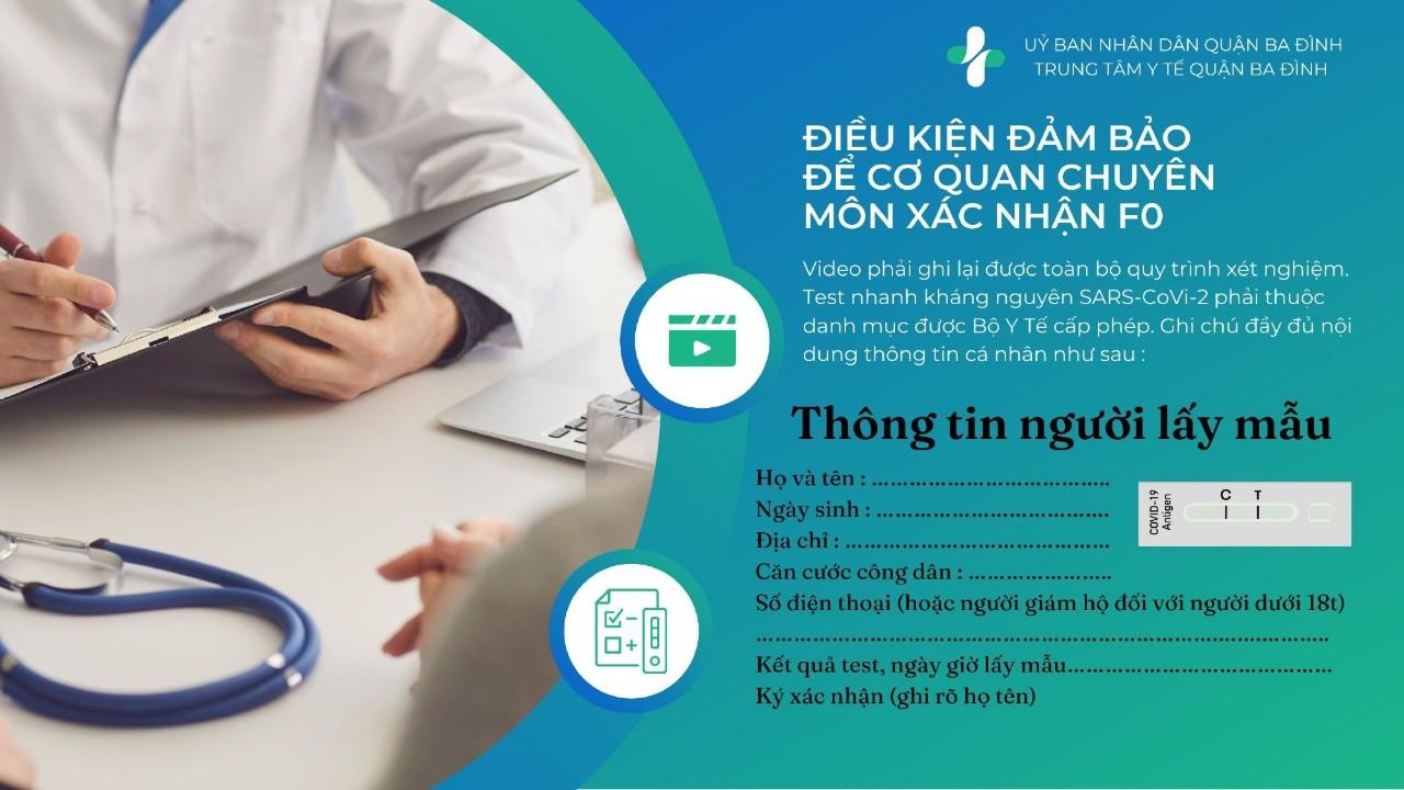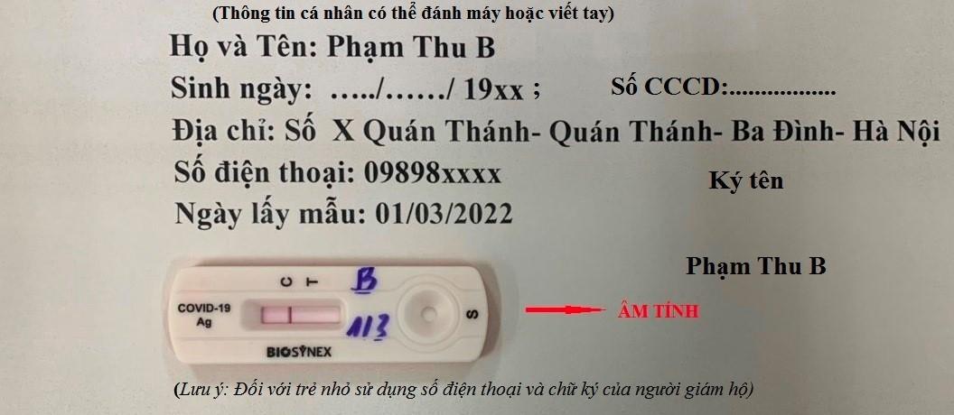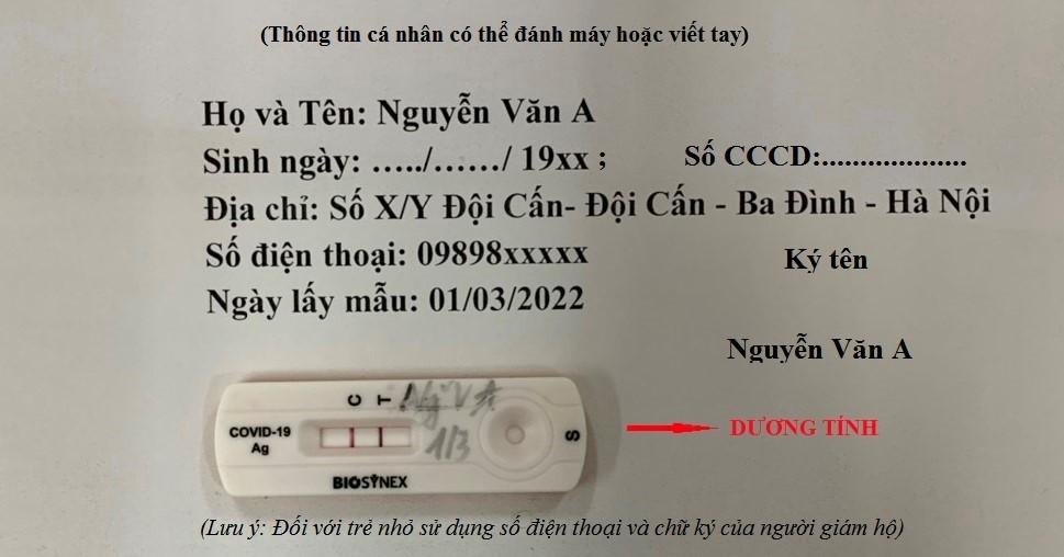 - Khay test nhanh được đặt trên tờ giấy trắng có ghi đầy đủ thông tin cá nhân của người tự làm test xét nghiệm Sars-Covi-2: Họ và tên, ngày tháng năm sinh, số căn cước công dân, địa chỉ lưu trú hiện tại của F0, số điện thoại, số điện thoại của người giám hộ đối với trẻ nhỏ, ngày lấy mẫu, người F0 ký ghi rõ họ tên (như hình ảnh ở trên)