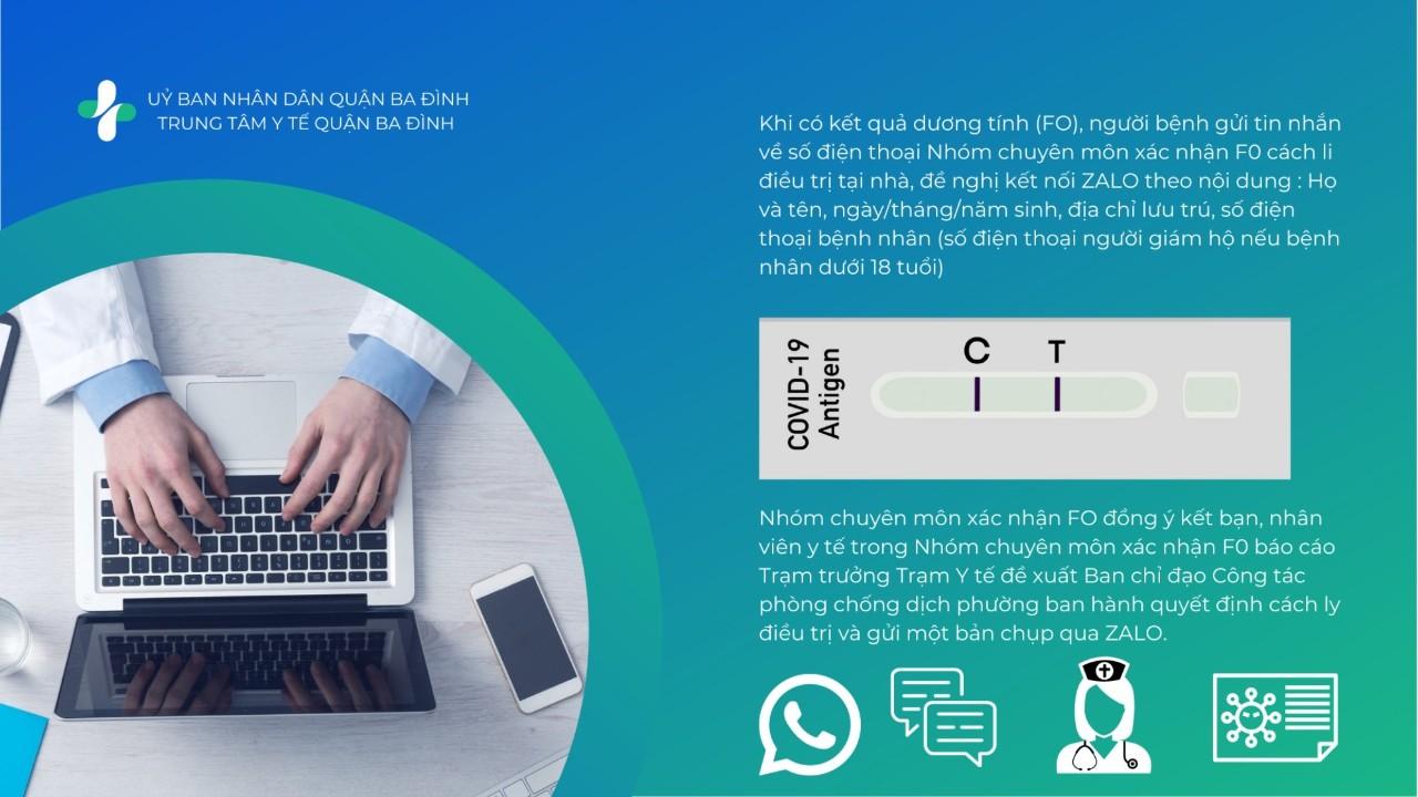 + Khi có kết quả dương tính (F0), người bệnh gửi tin nhắn về số điện thoại Nhóm chuyên môn xác nhận F0 cách ly, điều trị tại nhà nơi bệnh nhân lưu trú, đề nghị kết nối Zalo theo nội dung: (Họ và tên, ngày / tháng / năm sinh, địa chỉ lưu trú hiện tại của F0 , số điện thoại bệnh nhân xin được kết nối nhóm zalo xác nhận F0)