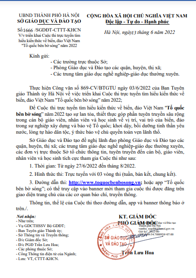 Sau đây là toàn văn công văn của Sở Giáo dục và Đào tạo Hà Nội về việc triển khai cuộc thi trực tuyến trong cán bộ, giáo viên, nhân viên và học sinh toàn thành phố Hà Nội. Ban giám hiệu trường Tiểu học Hoàng Diệu đề nghị toàn thể cán bộ, giáo viên, nhân viên và học sinh toàn trường nghiêm túc, nhiệt tình tham gia cuộc thi.
