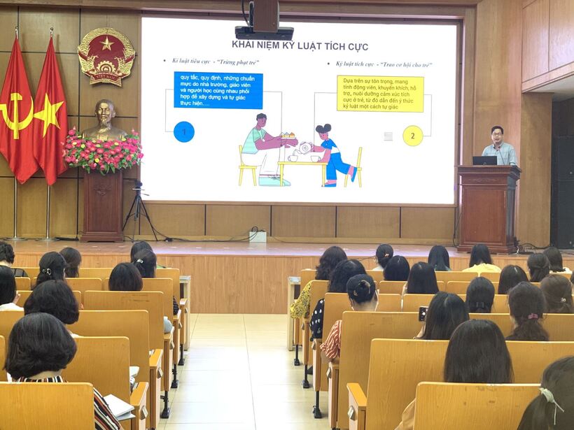 Giáo sư đã trao đổi 1 số nội chính của chuyên đề như: khái niệm, nguyên tắc, kỹ năng, quy trình... qua đó giúp các học viên nhận thức lại bởi những đòn roi trừng phạt về thể chất và tinh thần thời thơ ấu sẽ để lại những dấu ấn nặng nề trong tâm trí của trẻ và ảnh hưởng tiêu cực đến quá trình hình thành, phát triển nhân cách con người. Để trẻ lớn lên trong hạnh phúc, người GV mầm non cần hiểu và sử dụng hiệu quả hình thức “kỷ luật tích cực”. Kỷ luật tích cực dạy trẻ biết hành vi nào được phép, hành vi nào là không được phép và lý do tại sao? Qua đó giúp trẻ nhận ra hành vi sai trái của mình và có ý thức trách nhiệm sửa lỗi. Kỷ luật tích cực gây dựng mối quan hệ tôn trọng giữa GV và trẻ; gián tiếp dạy trẻ những cách cư xử lịch sự nhã nhặn, không bạo lực, có sự tôn trọng bản thân, biết cảm thông và tôn trọng quyền của người khác. Động viên khuyến khích trẻ thực hiện những hành vi đúng đắn phù hợp với chuẩn mực đạo đức, xây dựng ở trẻ sự tự tin và lòng tự trọng.