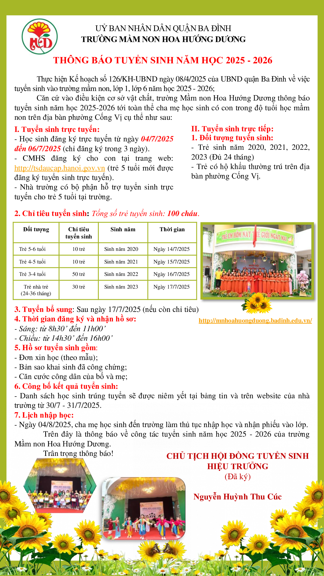 Trường Mầm non Hoa Hướng Dương thông báo tuyển sinh năm học 2025 - 2026